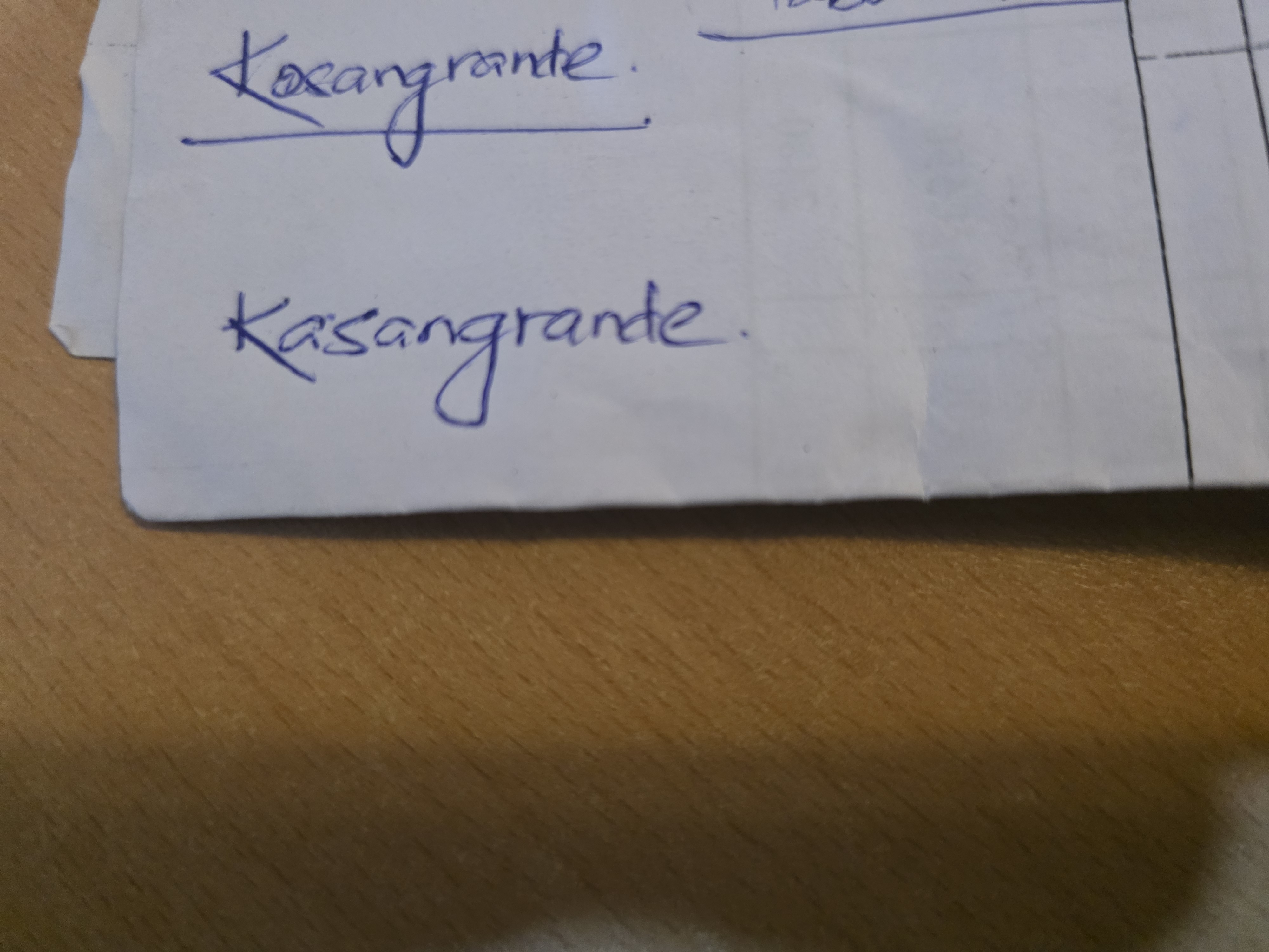 The handwriting exhibits a slight upward slant, evident in the way the letters and words tend to ascend from left to right. The baseline is somewhat unstable, and there is an impression of movement and energy in the strokes, particularly in the elongated loops of the 'g' in 'kasangrande'. The size is moderate, and the writing is generally legible, although the spacing between letters could be more consistent.