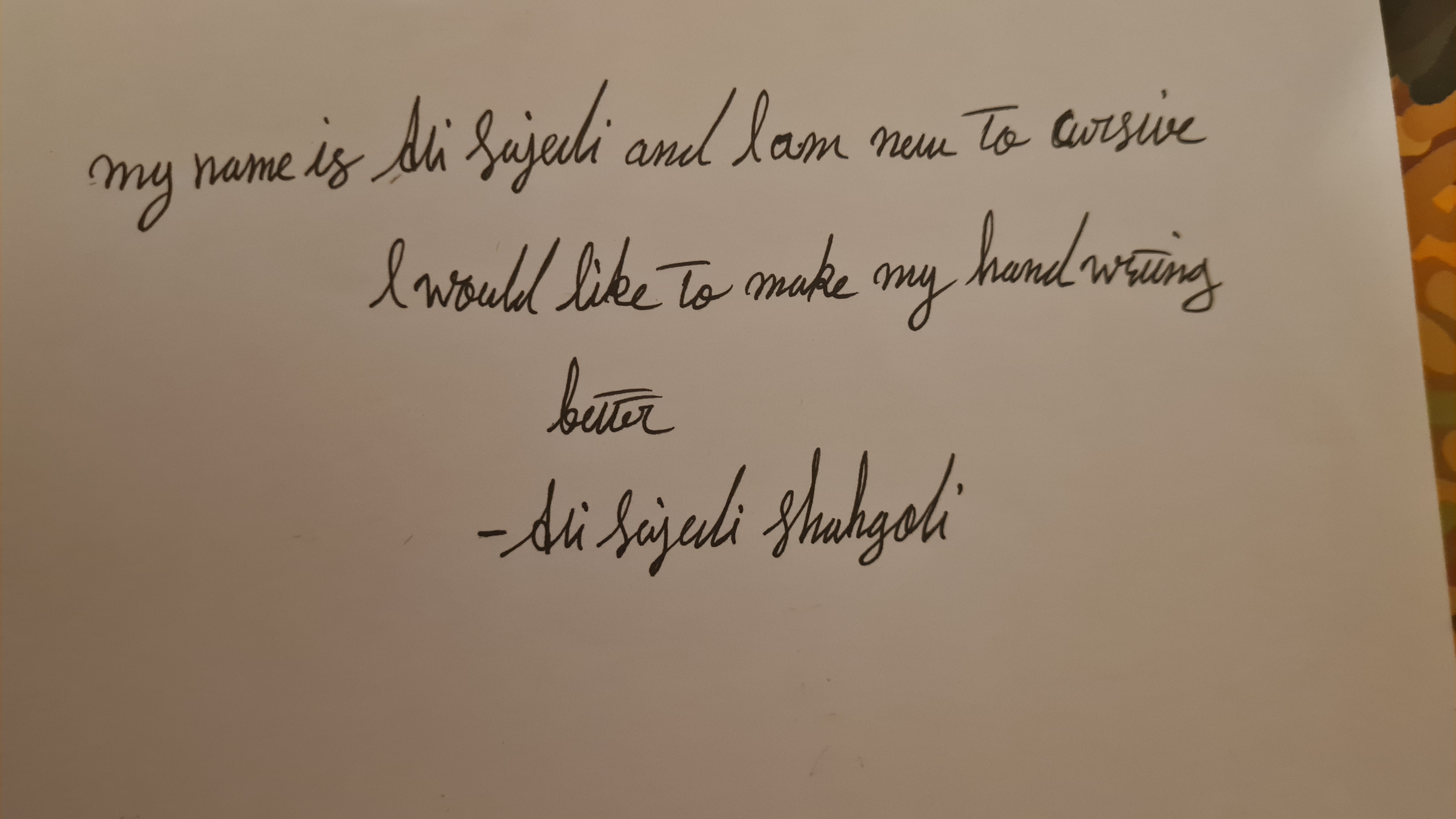 Based on the careful, somewhat deliberate nature of the handwriting, it suggests a personality that is thoughtful and conscientious. The desire to improve the handwriting indicates a person who values self-improvement and is willing to put in the effort to learn and grow. There is an element of precision, but also a touch of artistic flair in the looping ascenders and descenders, which implies a creative side.