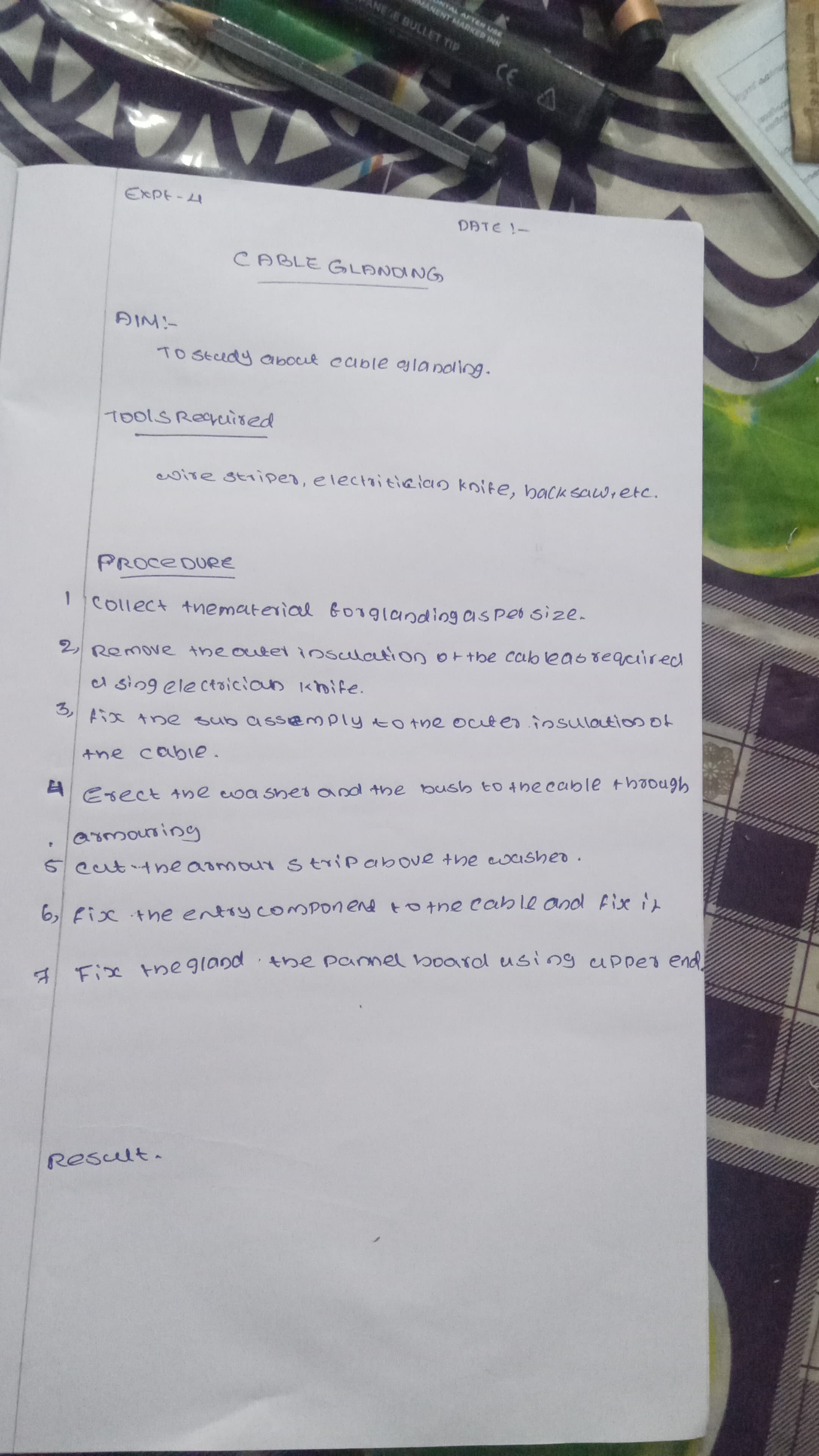 The handwriting is neat and upright, demonstrating a practical and straightforward approach. The letter formations are generally simple and clear, although there is some inconsistency in the slant and spacing. The writing is legible, but there are some instances of imprecise letter formation, for example, the somewhat unclear 'm' in 'thematerial' and the inconsistent loop of the letter 'l' as seen in 'cable glanding'. The size of the letters is relatively uniform, suggesting a desire for order and clarity. The pressure appears consistent, implying a steady and reliable nature.