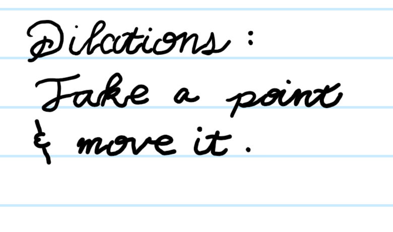 The handwriting sample displays a clear, rounded style with a consistent slant and form. The letters are well-formed and connected, creating a flowing appearance, with the descenders of letters like 'p' and 't' being moderately long. The pressure applied seems even throughout the sample. The size of the letters is relatively uniform, and the spacing between words is adequate, contributing to the overall legibility of the text. The words โDilationsโ and โTake a point & move itโ demonstrate the neat and deliberate nature of the script.