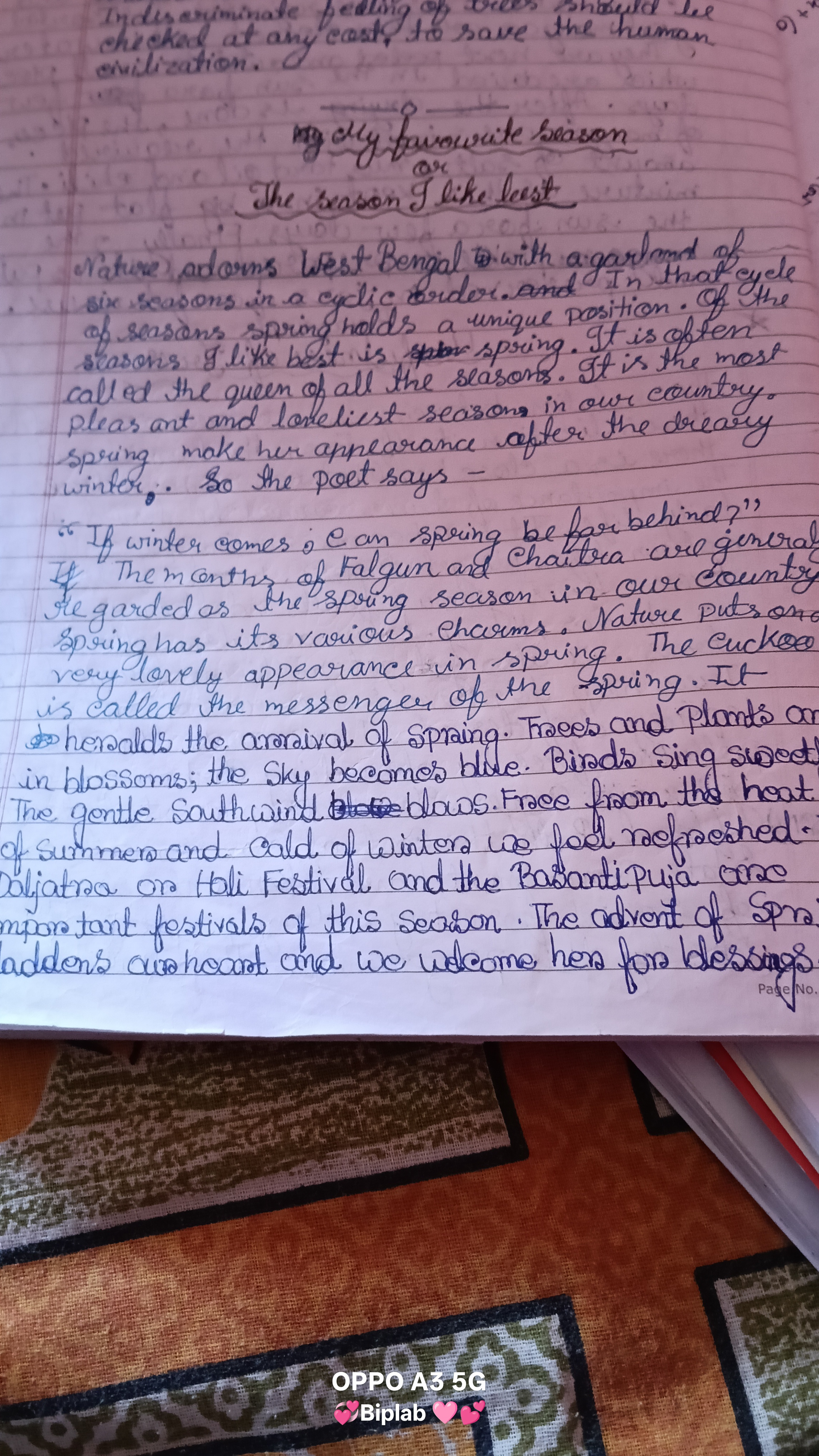 The handwriting sample displays a flowing, connected style, evident in phrases like "Nature adorns West Bengal". The letter forms are rounded and generally consistent, though some words appear slightly rushed, sacrificing neatness for speed. The slant is fairly consistent, leaning slightly to the right, and the baseline wavers gently, creating a sense of movement across the page. Legibility is generally good, though some individual letter formations could be clearer.