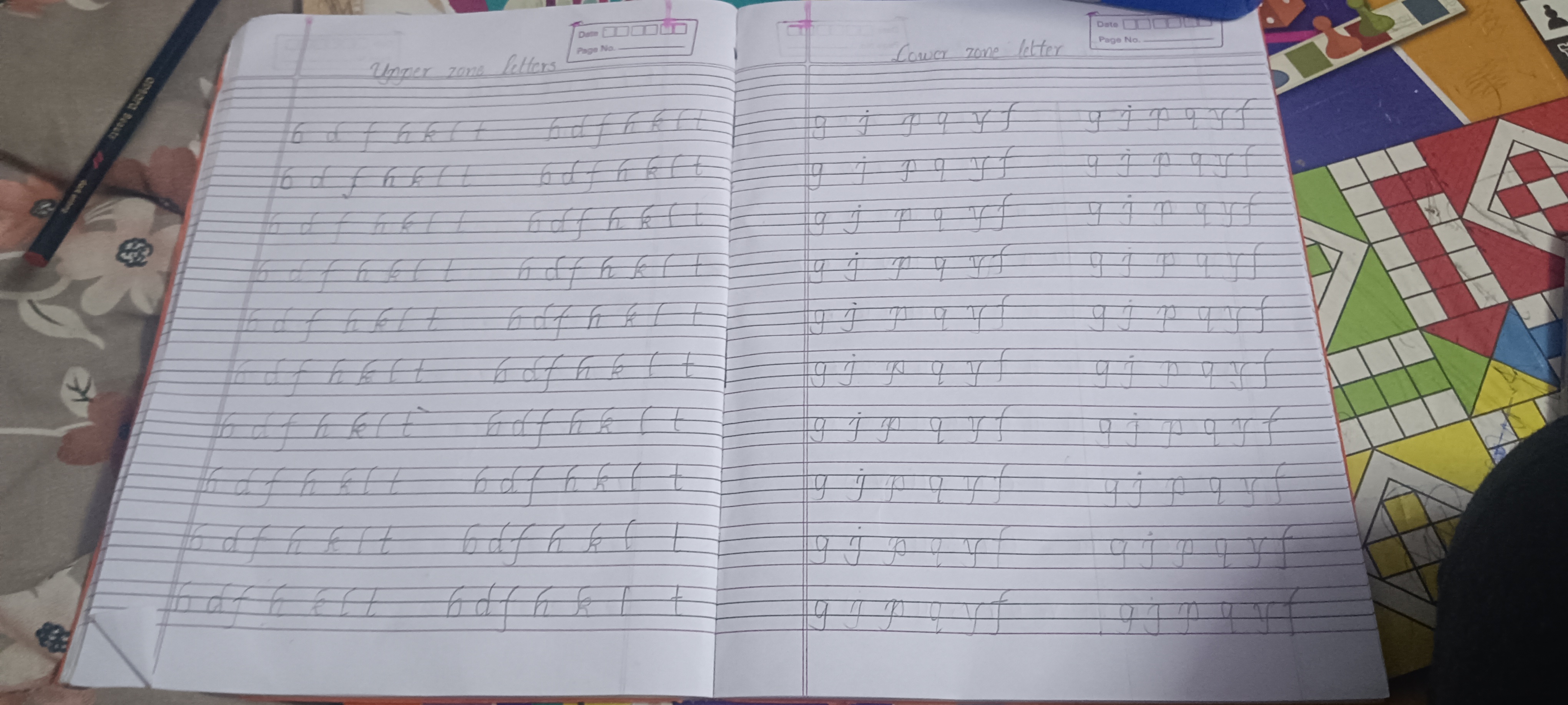 The handwriting sample presents a clear attempt at controlled letter formation. There's a focus on replicating shapes, as seen in the repetition of 'b d f h k l t' and 'g j p q y f'. The writing leans towards being upright with minimal slant, and the pressure appears consistent, resulting in uniform line thickness. The writer has attempted to maintain a consistent baseline, staying within the provided lines, although some letters slightly deviate.