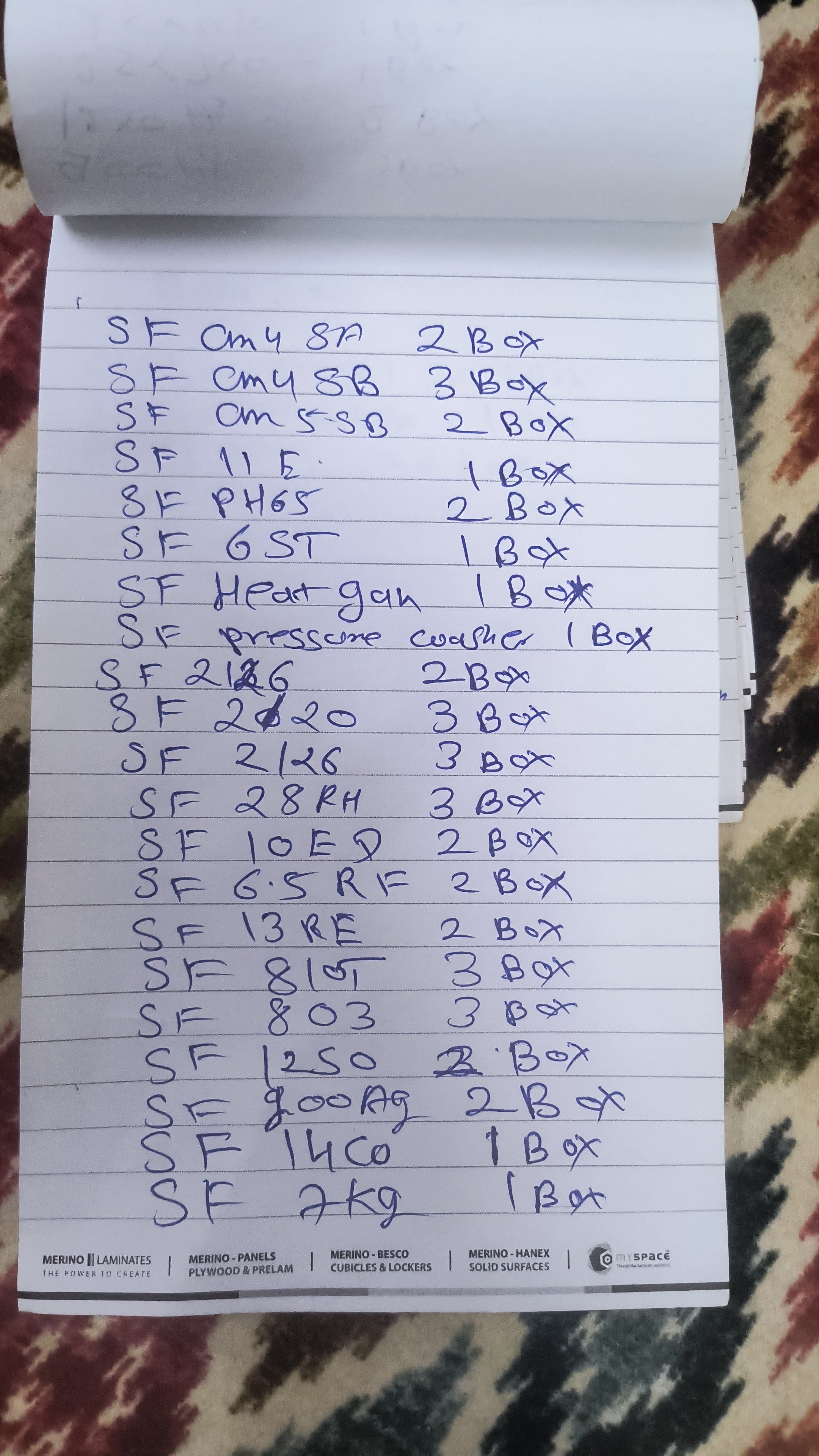 The handwriting in this sample is primarily functional, favoring clarity over elaborate flourishes. The letters are formed with a directness, with 'SF' consistently appearing before each item. The size of the letters is relatively uniform, contributing to overall legibility. There's a sense of purpose in each stroke, indicative of a focused approach. Some instances show a slight slant, but overall the writing maintains a vertical alignment, suggesting a controlled demeanor.
