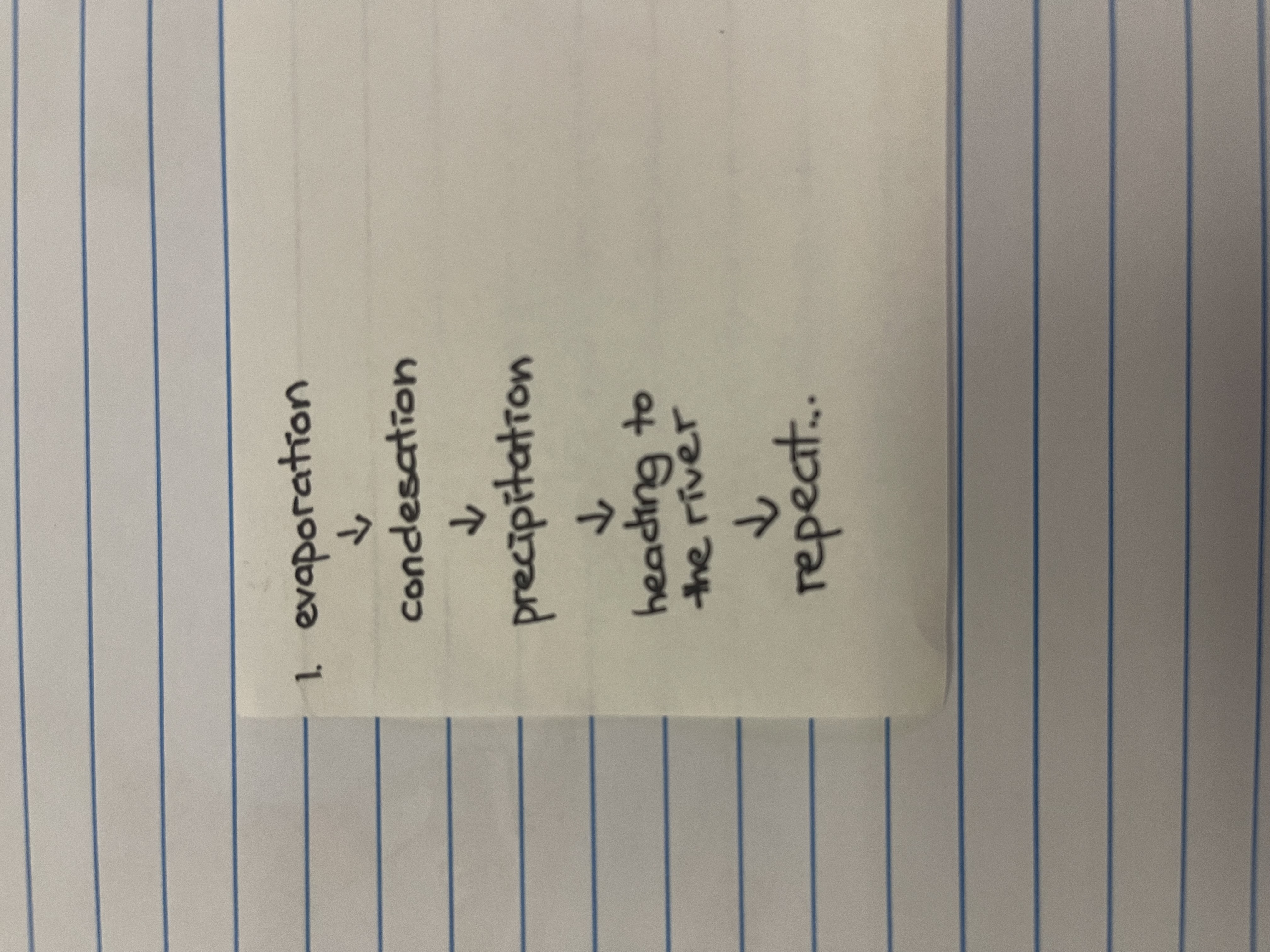 Your handwriting has a neat and straightforward quality. The letters are upright and fairly uniform in size, as seen in words like "evaporation", "condensation", and "precipitation", suggesting a desire for clarity and order. The letter spacing is consistent, which enhances readability. There is a slightly rounded quality to the letterforms, particularly in letters like 'o' and 'e'.