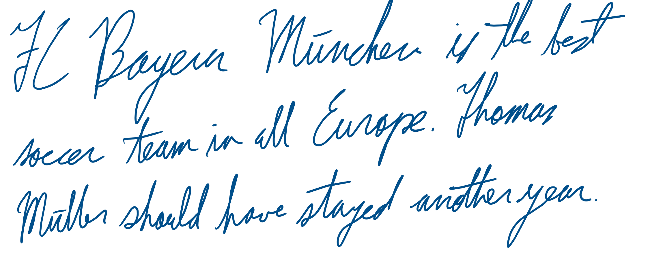 The handwriting in this sample is characterized by its fluid, cursive style, featuring generous loops and rounded forms. The connections between letters are frequent, creating a sense of flow, as seen in the words "Bayern MΓΌnchen". However, there's a degree of inconsistency in letter size and spacing, and the baseline wavers slightly, indicating a possible lack of strict adherence to structure. The slant is generally consistent, and the pressure appears moderate.
