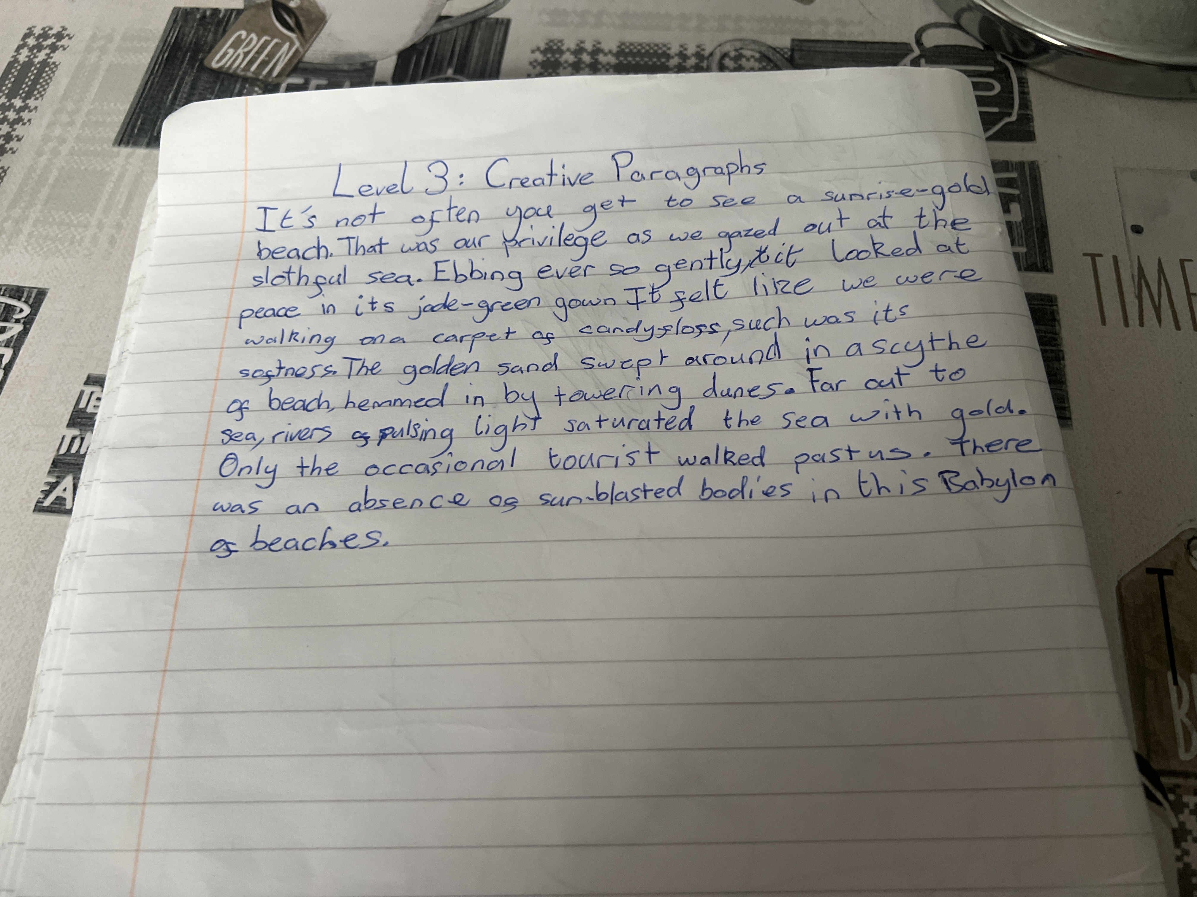 The handwriting presents a rounded, almost bubbly appearance, especially in letters like 'o' and 'a'. There's a slight forward slant, giving it a sense of momentum, as if the words are eager to leap off the page. The connections between letters are generally smooth, though there are occasional breaks that suggest a thoughtful pause. The size is fairly consistent, creating a harmonious flow across the lined paper. The words are carefully placed, avoiding a cramped feel, as demonstrated by the generous spacing in the phrase 'Creative Paragraphs'.