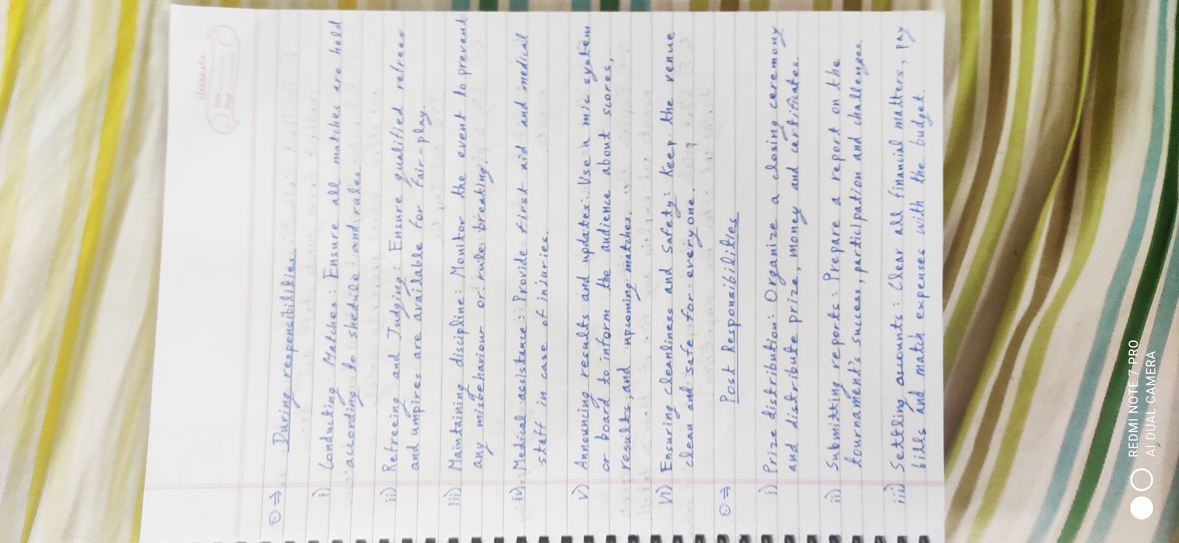 The handwriting is characterized by its upright posture and uniform size, suggesting a practical and organized approach. The consistent spacing between words and lines, as seen throughout the "responsibilities" sections, creates a sense of clarity and structure. The letter formations are generally rounded, giving the writing a friendly and approachable feel, although the occasional sharp angle indicates moments of decisiveness. The overall impression is one of neatness and legibility, reflecting a desire for clear communication.