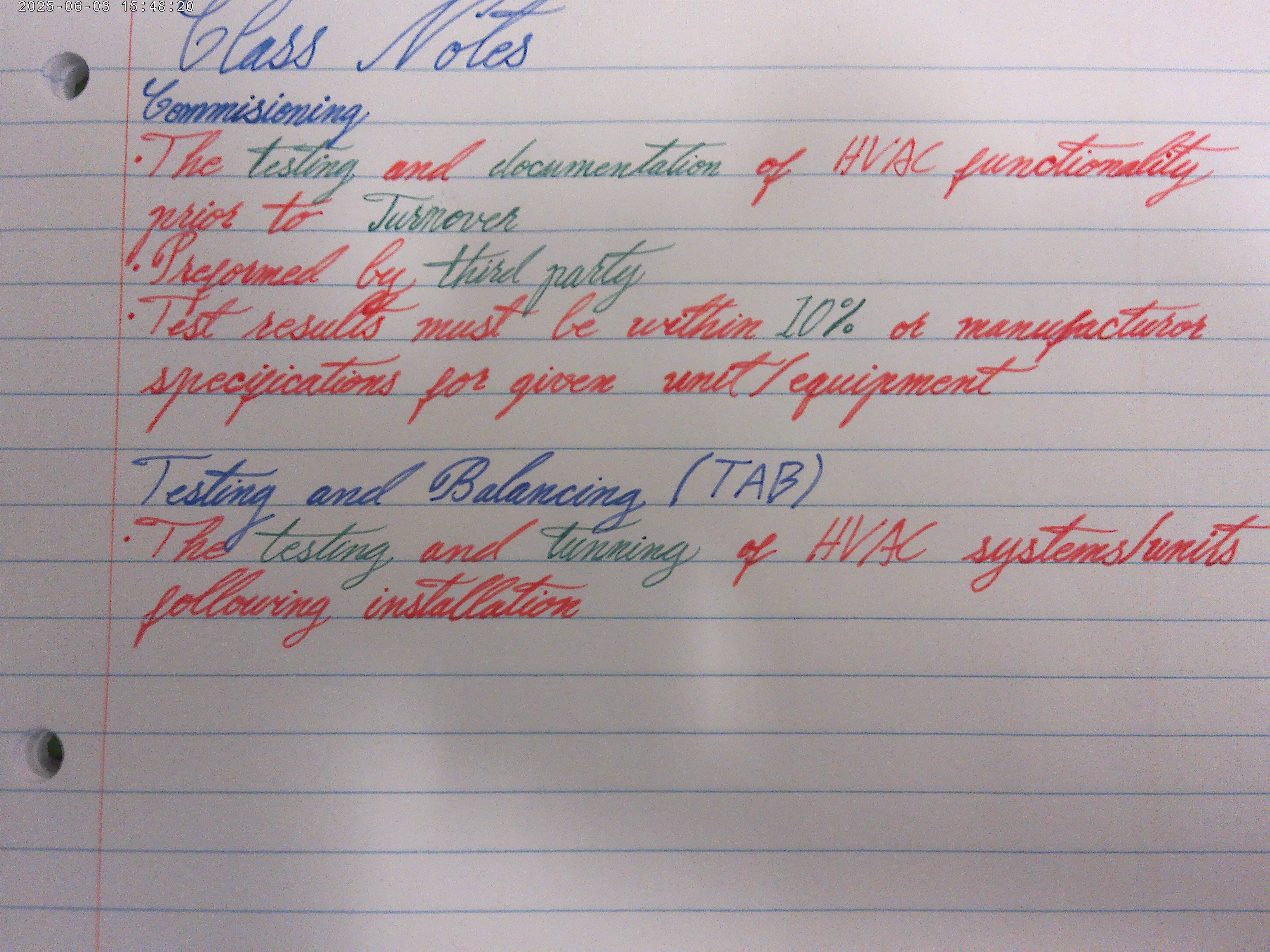 The handwriting style is characterized by a mix of cursive and print, with noticeable loops and curves, especially in words like "Commissioning" and "documentation". There is a moderate slant to the right. The pressure applied appears to be relatively consistent, and the writing generally follows the lines on the page, though with slight variations. The letter sizing is mostly uniform, although there are a few instances where letters are slightly compressed or elongated. The legibility is quite good, though some words like "manufacturer" could benefit from more distinct letter formation.