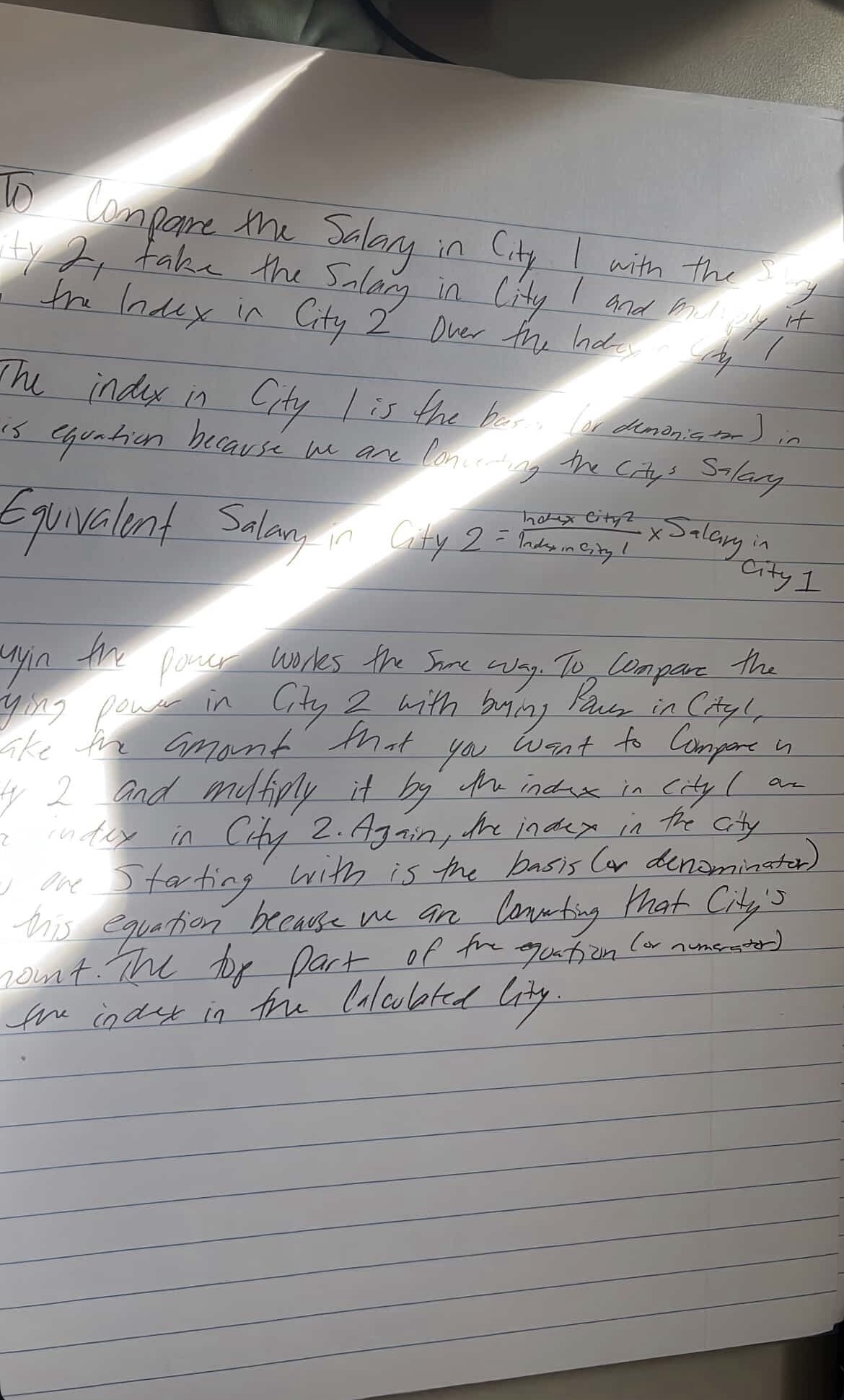 This handwriting presents a neat, functional style. The letters are generally well-formed, and there is a clear attempt at legibility, although some words appear a little rushed. The baseline adherence is relatively consistent, indicating good control. Letter size is moderate, suggesting a balanced approach. Spacing between words is consistent. The overall impression is of someone who prioritizes clarity and functionality over elaborate flourishes. Words such as 'Salary', 'Equivalent', and 'Calculated' are carefully written, suggesting attention to detail when the subject matter is important.