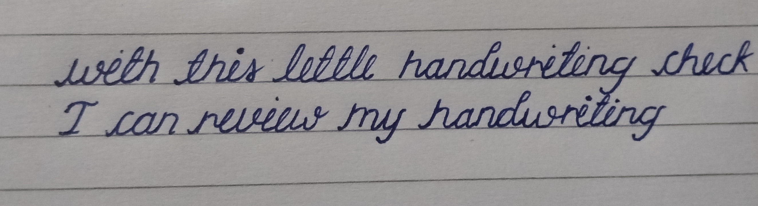 The handwriting style is characterized by its rounded, flowing forms. Letters connect seamlessly, creating a sense of continuity and rhythm, for example in the phrase "little handwriting check". The loops in letters like 'l' and 'e' are generous, and the overall impression is one of fluidity and grace. There is a moderate slant to the right, and the pressure appears consistent throughout the sample. The size of the letters is fairly uniform, although there's a slight variation. The writing sits comfortably on the lines, suggesting a good sense of organization.