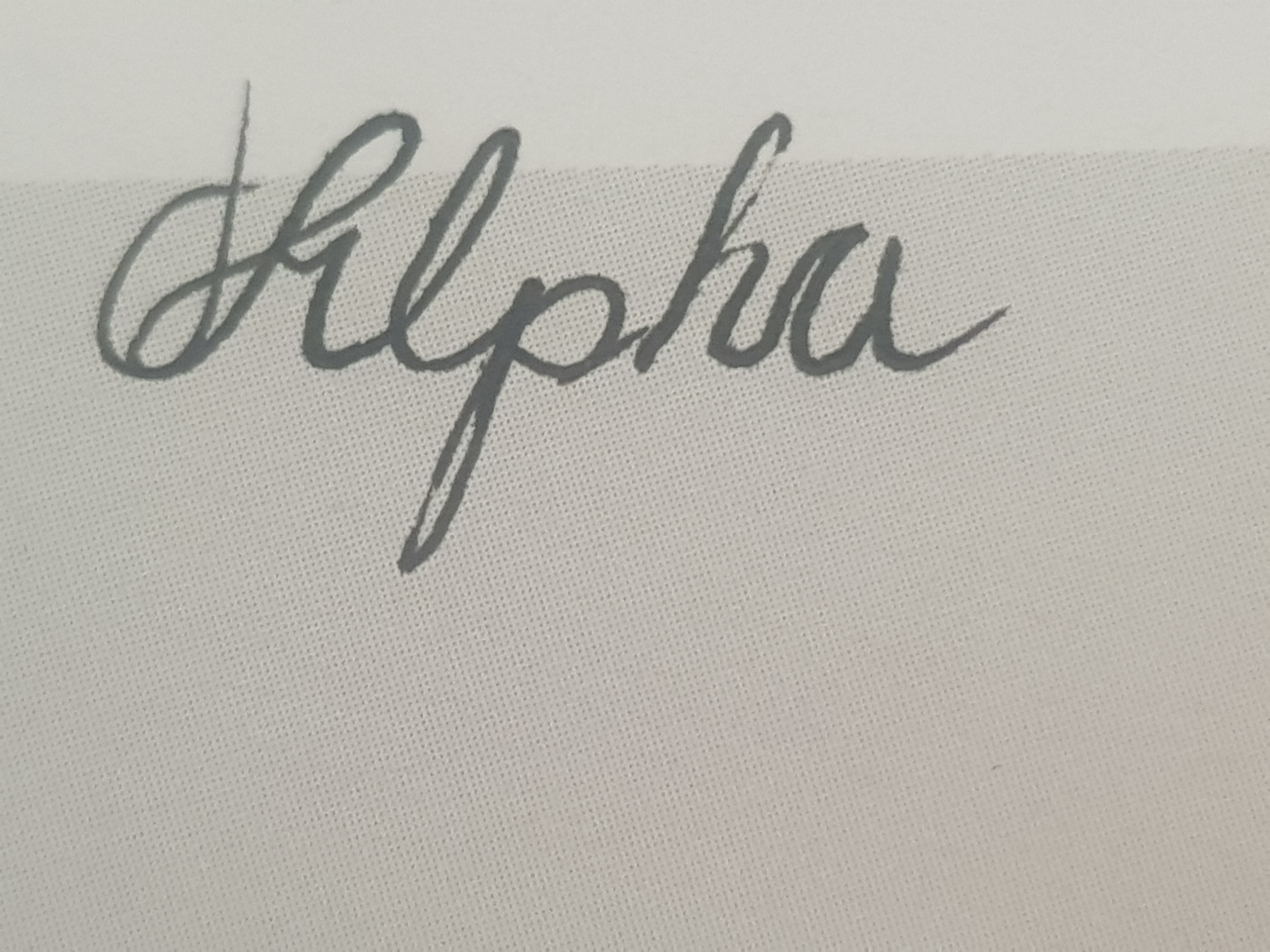 The handwriting presents as a fluid, cursive style with notable loops and rounded forms, exemplified by the prominent 'l' and 'h' in "Alpha". The connections between letters appear seamless, suggesting a continuous flow of thought. The pressure seems relatively consistent throughout the sample, and the overall impression is one of a controlled and deliberate hand.