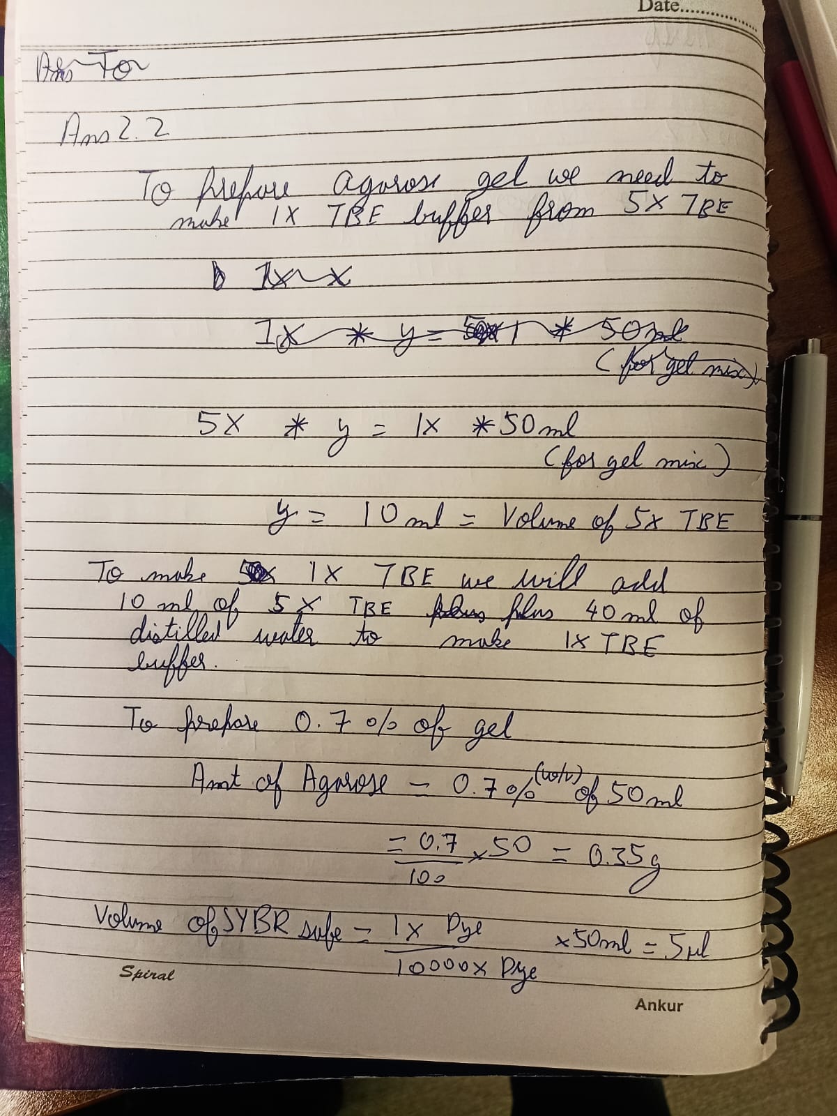 The handwriting sample displays a functional, almost utilitarian style. The letter formation is generally clear, prioritizing legibility over artistic flair. There's a slight rightward slant, suggesting a degree of forward-thinking and engagement. The writing appears somewhat cramped, with letters close together, as seen in the words "prepare agarose gel". While the letter sizes are reasonably consistent, there is some variability, especially in the height of ascending letters like 'T' and 'b'.