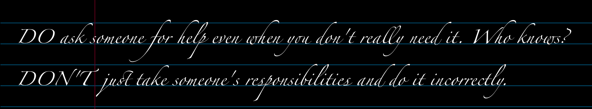 The handwriting sample presents a formal, almost calligraphic style. The capital letters 'DO' and 'DON'T' are prominently displayed with elaborate curves and serifs. There is a clear attempt at maintaining a consistent baseline, aided by the lined paper. The letters are generally well-formed, though some, like the 'f' in 'for' and the loops in 'l' and 'y', are particularly flourished. The spacing between words is generally good, contributing to the overall legibility.