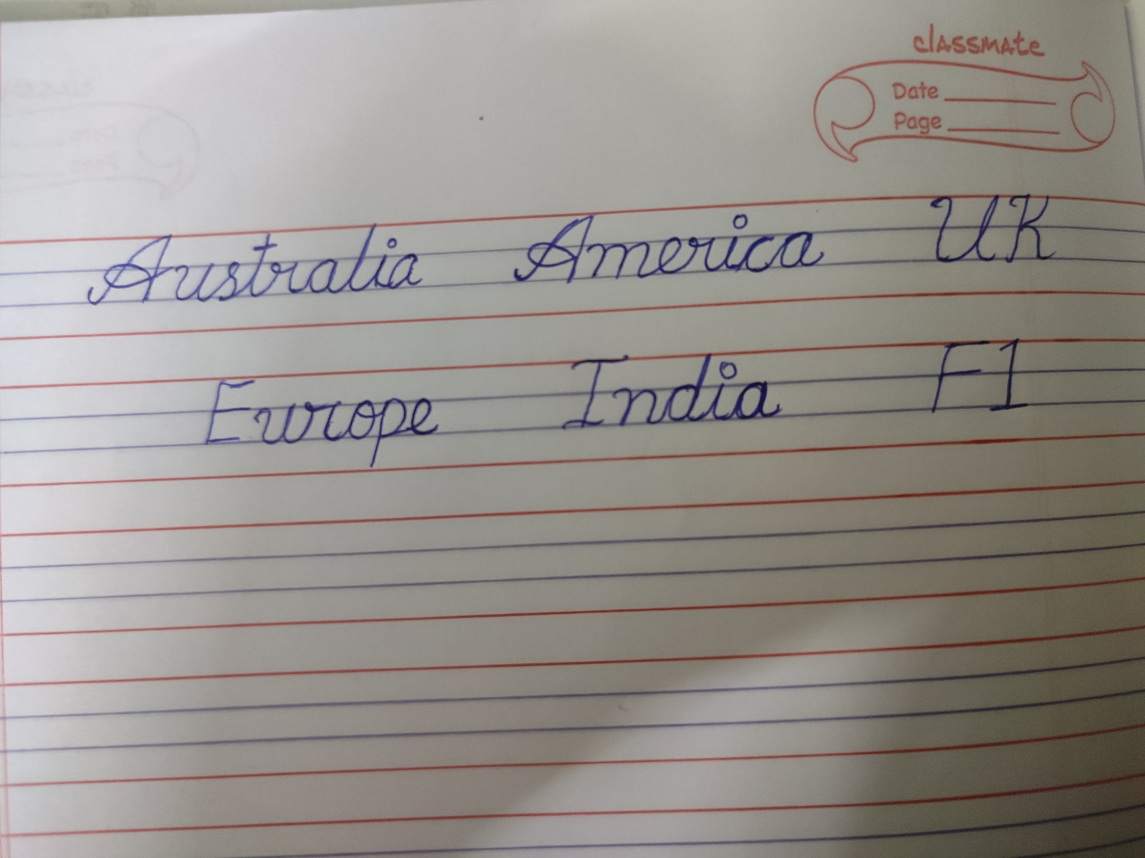 The handwriting presents a connected, cursive style with notable loops and rounded forms, particularly in letters like 'A', 'U', and 'E'. There's a sense of uniformity in letter height and spacing, though the slant is slightly variable. The overall impression is one of practiced handwriting, but it lacks a certain dynamism; it's quite neat and legible but could be more fluid. The 'F' and '1' in 'F1' show a different style than the other letters, as they are written with straight lines, unlike the curved style of the rest of the handwriting sample.