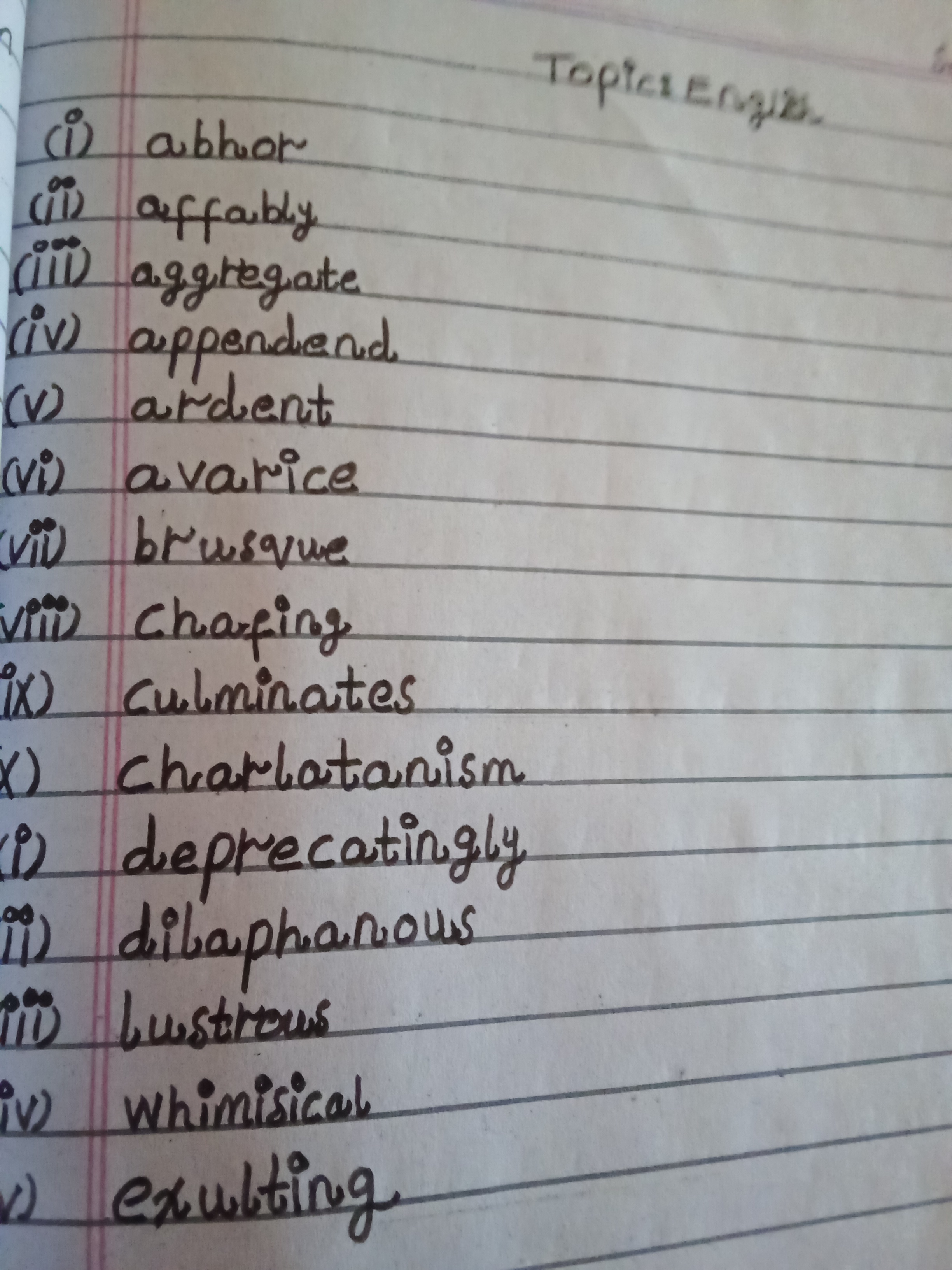 The handwriting exhibits a looping, cursive style with rounded letterforms, seen clearly in words like "affably" and "aggregate." There's a generally consistent slant and size throughout the sample, contributing to a sense of visual harmony. The writing appears neat and mostly legible, with deliberate strokes suggesting care and attention to detail. Some letter formations, like the 'q' in "brusque" and 'h' in "chafing" have a unique flourish. The writing is compact and contained within the lines, with consistent spacing between words.