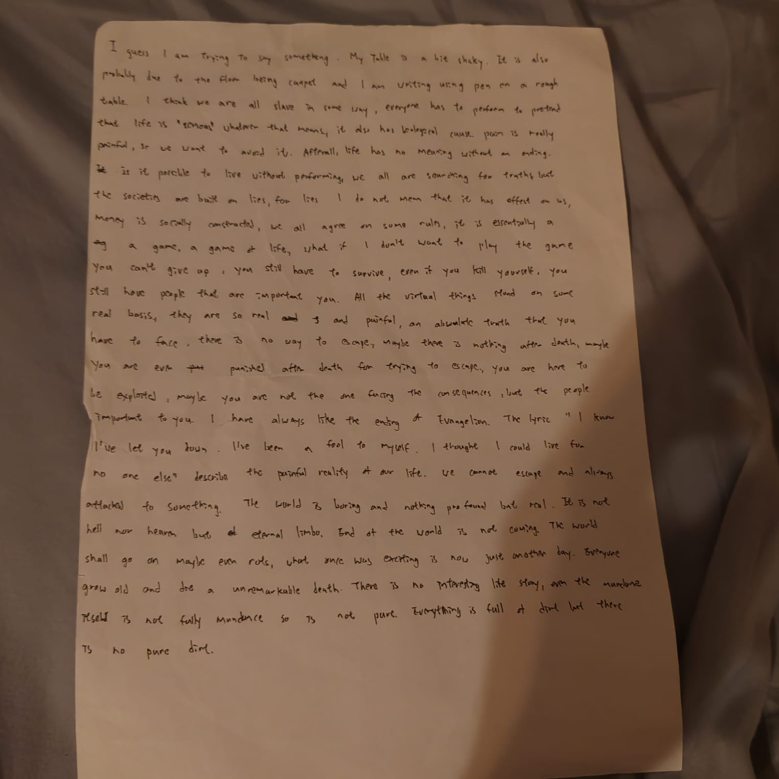 This handwriting hints at a personality that is introspective and philosophical, grappling with deep questions about life, meaning, and society. The irregular letter sizing and variable spacing suggest a mind that is active and engaged, possibly prone to fluctuations in mood or energy levels. There's a sense of creativity and intellectual curiosity, but also a hint of underlying anxiety or restlessness, as evidenced by the cramped letter formations.