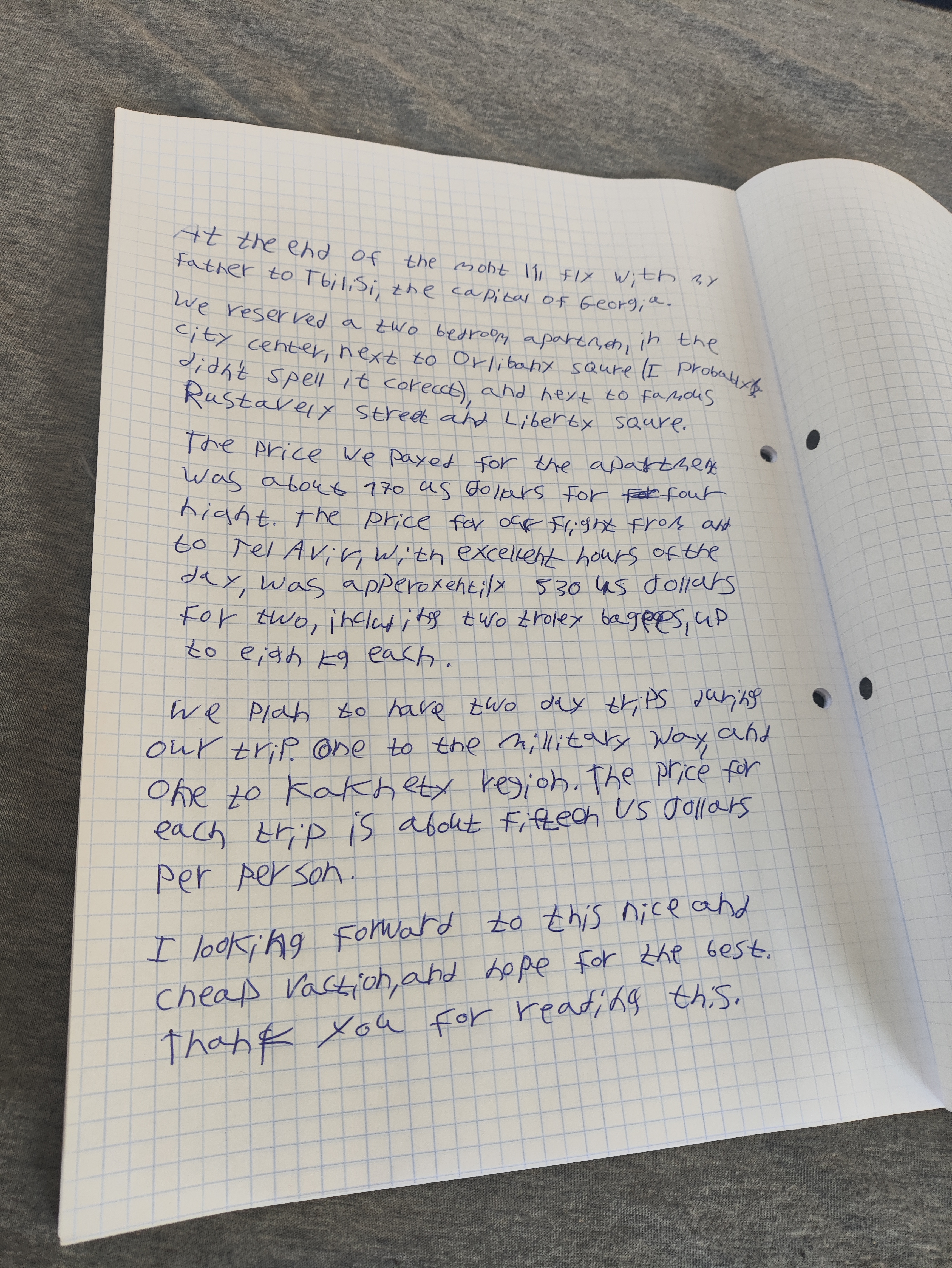 The personality suggested by this handwriting is that of someone who is organized and down-to-earth. They value experiences and are keen to plan meticulously. The slight irregularities indicate a creative mind that doesn't always adhere strictly to rules. There's a sense of optimism and forward-thinking, evident in the phrase "I looking forward." They likely possess a pragmatic approach to life and a strong desire to explore new places.