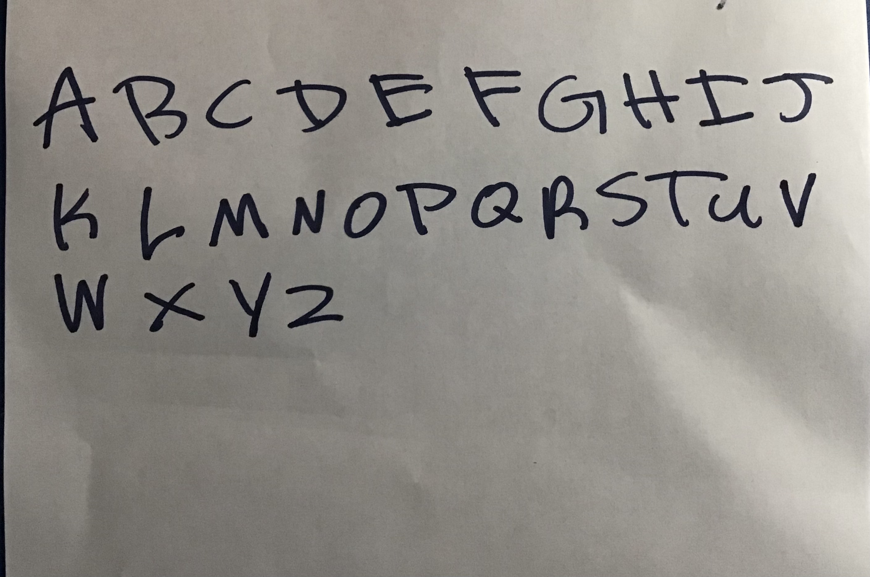This handwriting style exhibits a blocky, almost architectural quality, with clearly defined letterforms. The capital letters are large and uniform in height. There is a degree of consistency across the letters, though the 'R' and 'S' deviate slightly. The pressure appears consistent throughout, resulting in even strokes. Overall, the handwriting leans towards the side of functionality over flair.