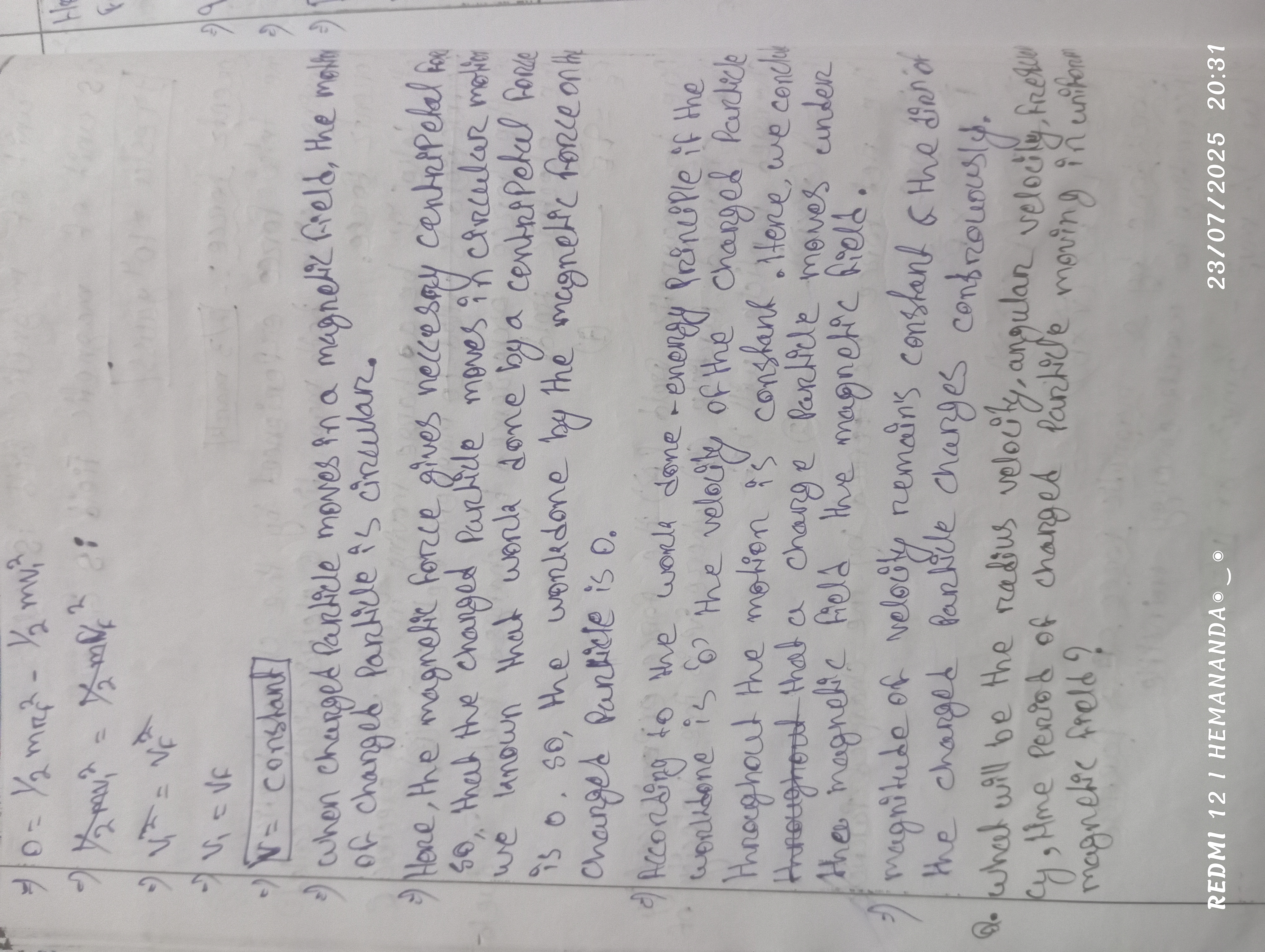 Your handwriting style exhibits a flowing, cursive script, characterized by rounded letterforms and a tendency toward connecting letters. The words "charged particle moves" reveal a preference for loops and curves. The overall appearance is somewhat inconsistent, with variations in letter size and spacing, creating a slightly uneven texture on the page. There is an obvious slant to the right.