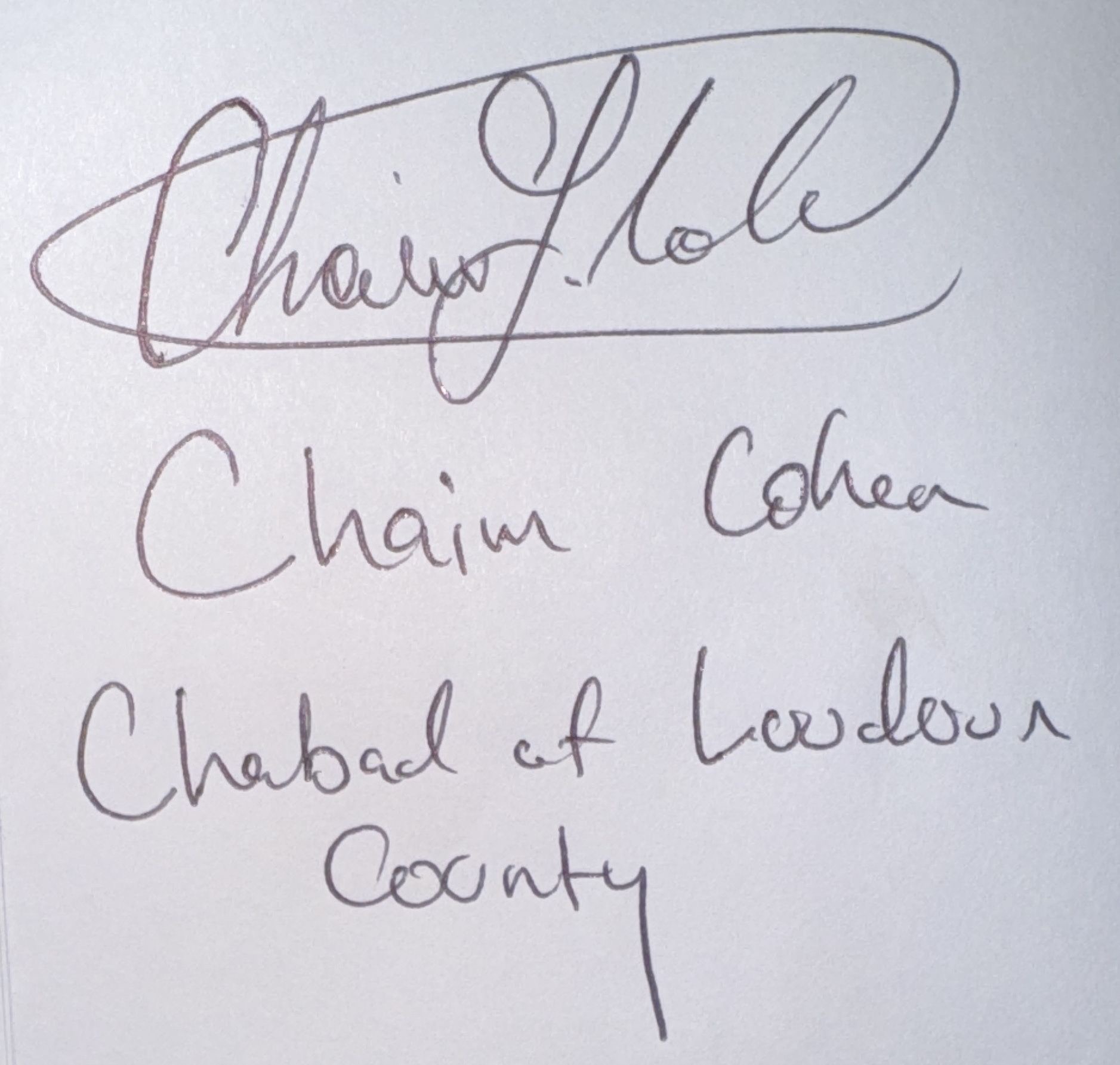 The handwriting displays a striking contrast between a highly stylized, almost calligraphic signature and a more straightforward, unadorned script. The signature, encircled with a grand oval, features flowing loops and elaborate flourishes, particularly in the 'lobe' portion. Below the signature, the handwriting in 'Chaim Cohen' and 'Chabad at Loudoun County' is simpler, with rounded letterforms and a more consistent baseline. There is a mix of cursive and print-like letters, contributing to an overall impression of controlled informality. The 'y' in 'County' has a particularly long descender.