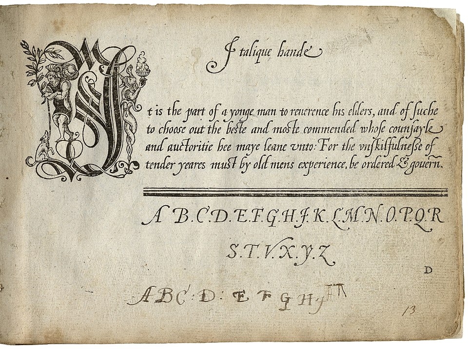 The handwriting exhibits a formal, practiced style, consistent with the 'Italique hande' it claims to be. The letterforms are carefully shaped, with distinct ascenders and descenders, lending a sense of elegance and refinement. There's a deliberate rhythm in the way words are spaced and lines are aligned, creating a visually pleasing composition. The use of ligatures, like the '&' symbol and flourishes, adds to the overall decorative effect. Some letters are slightly condensed, while others are more generously proportioned, giving the text a balanced, yet dynamic feel.