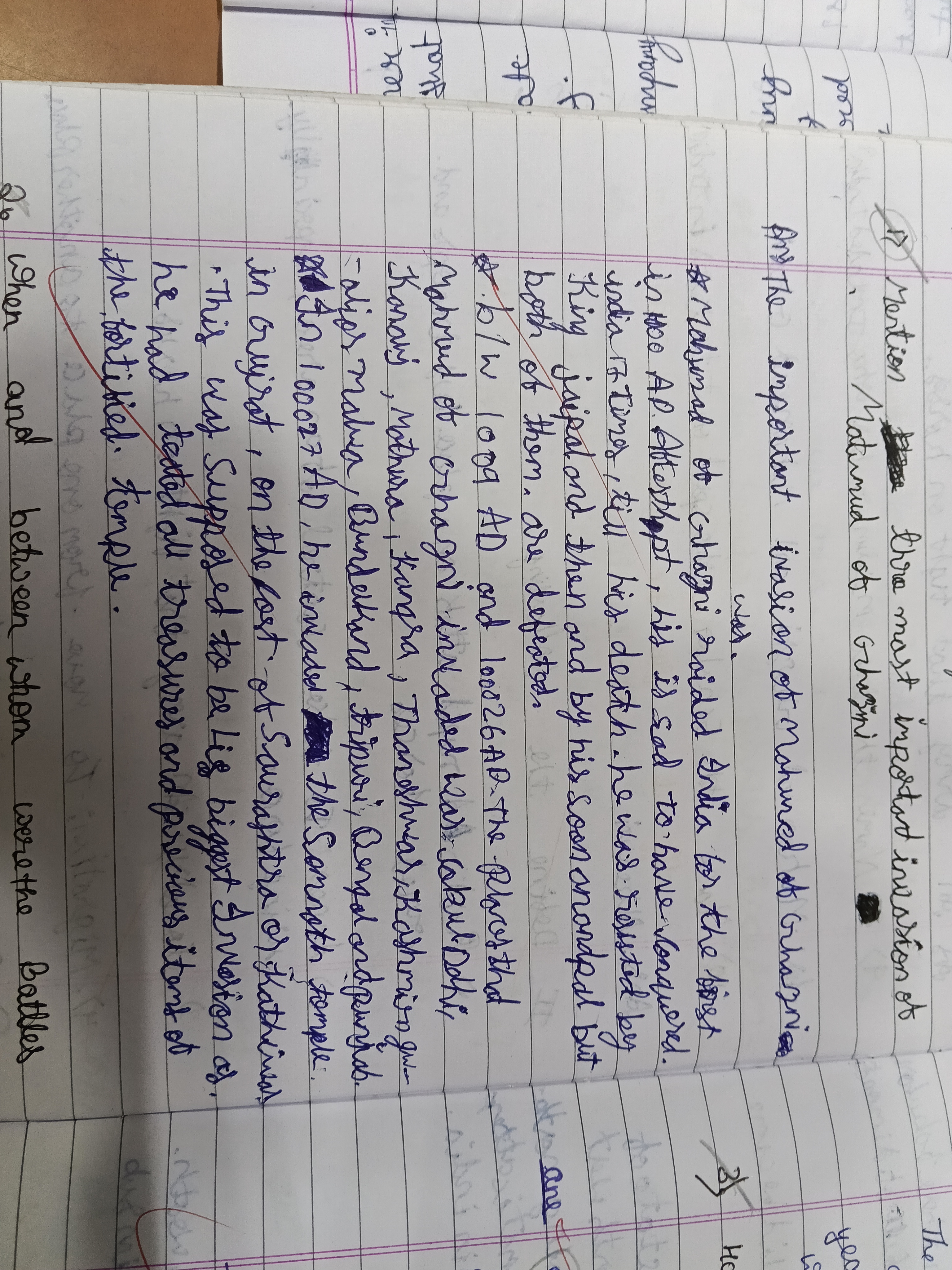 The handwriting presents a consistent slant towards the right, suggesting an open and approachable demeanor. The letter formations are generally rounded, though some exhibit a slight angularity. The baseline is mostly consistent, though there are slight variations. Spacing between words is generally good, enhancing legibility. The size of the letters is moderate and consistent throughout the sample. Words such as "Ghazni", "important", and "temple" are clearly formed, showcasing a good level of attention to detail.