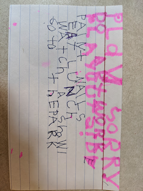 The handwriting sample displays a childlike style, with uppercase lettering predominating, such as in the word "PLAY". There's an inconsistent letter size and spacing. The strokes appear to be applied with varied pressure. Some words, like "EAPARK" are crowded together, suggesting haste or perhaps limited writing space. The alignment veers off course. There is also evidence of words crossed out, indicating possible revision or change of thought.