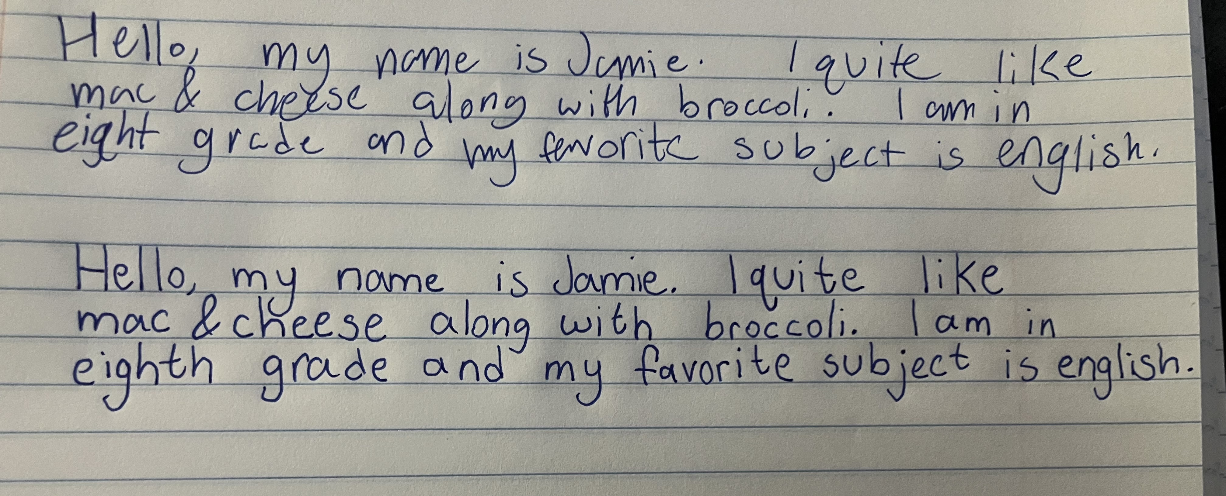 The handwriting sample displays a style that is neat and quite legible, although somewhat inconsistent in letter formation and size. There's a gentle slant to the right, suggesting an open and approachable nature. The letter 'y' is interesting with its loop and descent, and the words are evenly spaced, indicating thoughtfulness. There is repetition in the text. Overall, it is a charming and youthful handwriting style.
