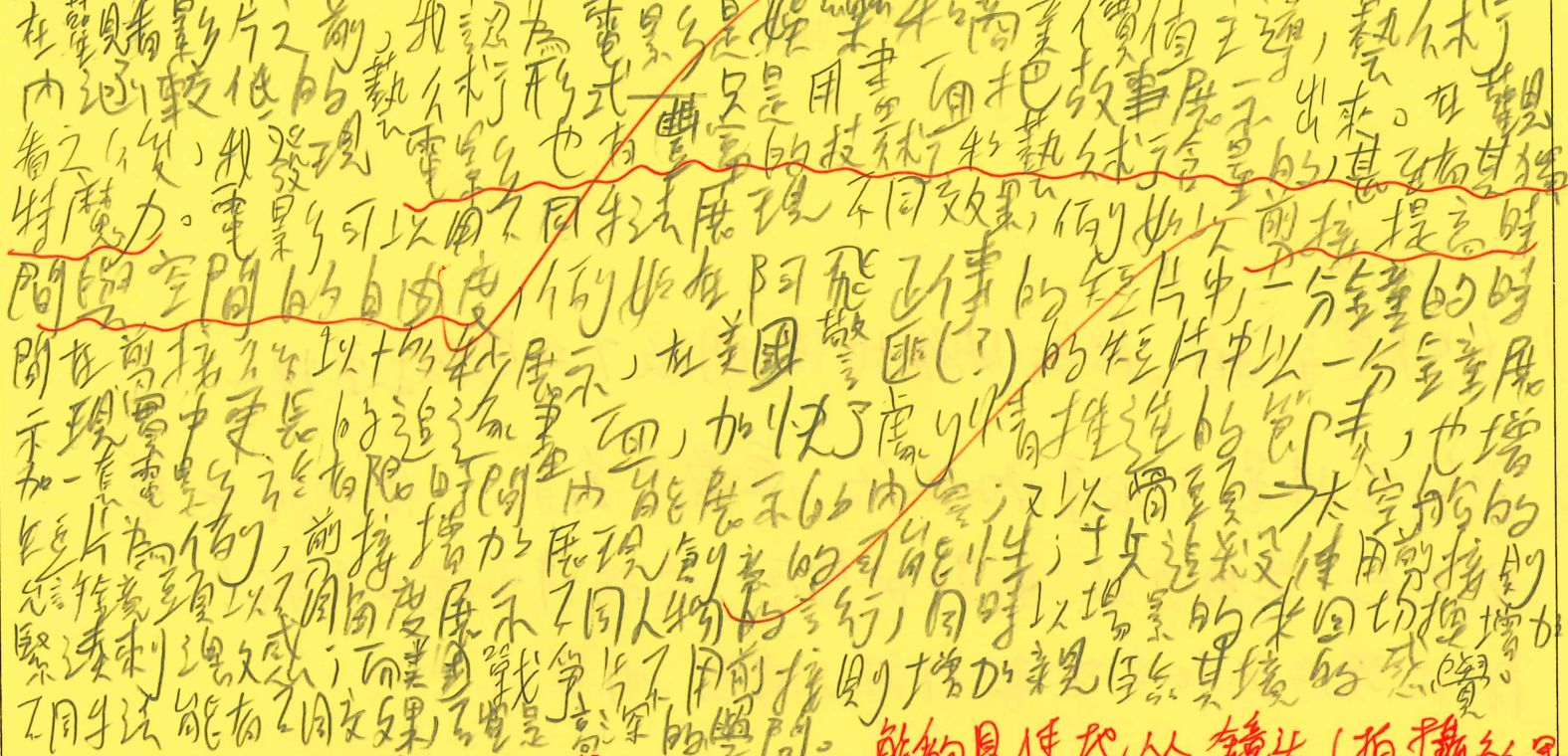 The handwriting sample displays a unique blend of fluidity and structure, with characters exhibiting a somewhat inconsistent slant and spacing. The strokes vary in thickness, adding a dynamic quality to the writing. Some characters, like those in "ε¨θ§ηε½±ηδΉε", appear more carefully formed, while others show a quicker, more impulsive execution. The overall impression is one of controlled freedom, where the writer balances legibility with personal expression.