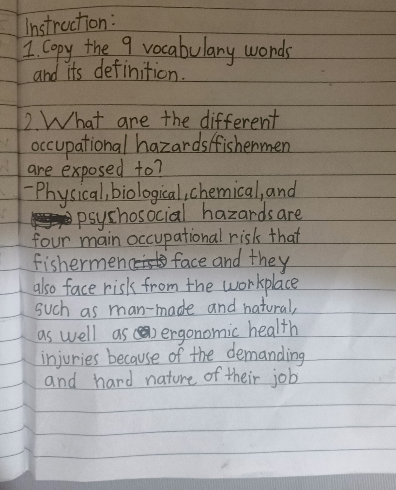 Your handwriting exhibits a blend of practicality and diligence. The overall impression is neat and orderly, with consistent letter formation, as seen in the repetition of 'a', 'e', and 'o' throughout the text. The spacing between words is regular, contributing to legibility, and the handwriting appears to follow the ruled lines of the paper closely. There's a certain straightforwardness in the style, suggesting a focus on conveying information clearly, rather than artistic flair. The occasional correction ('psychosocial') suggests attention to detail, but also a willingness to rectify mistakes.
