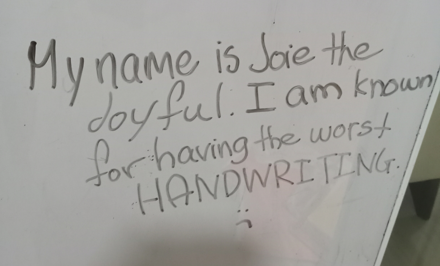 The handwriting sample presents a rather inconsistent style, oscillating between rounded and angular forms. Some letters, like the 'M' in 'My' and 'HANDWRITING' exhibit a degree of angularity, while others, such as the 'o' in 'Joie' and 'known', are distinctly rounded. The overall impression is one of variable pressure, with some strokes appearing darker and more defined than others, leading to a somewhat uneven texture. The size is also not uniform, with words like 'HANDWRITING' significantly larger than the rest of the text. The letter spacing also seems inconsistent, which contributes to its poor legibility.