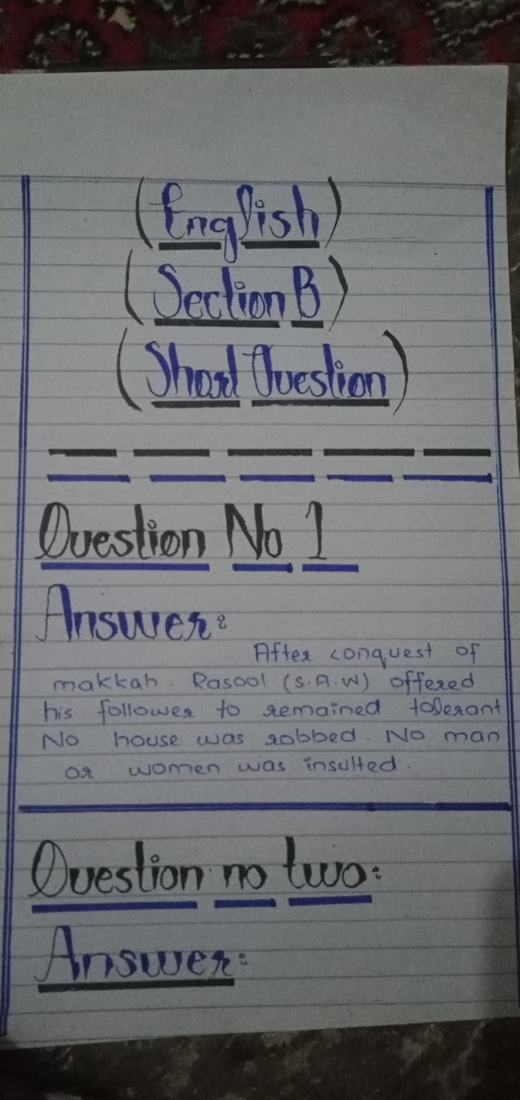 The handwriting presents a blend of neatness and slight imprecision. The capitalization of words such as "English", "Section B", and "Question" suggest a careful, perhaps academically-inclined approach. The text in response to the questions, however, is less carefully written and demonstrates some inconsistent letter formations. The spacing is somewhat inconsistent, with words occasionally running together.