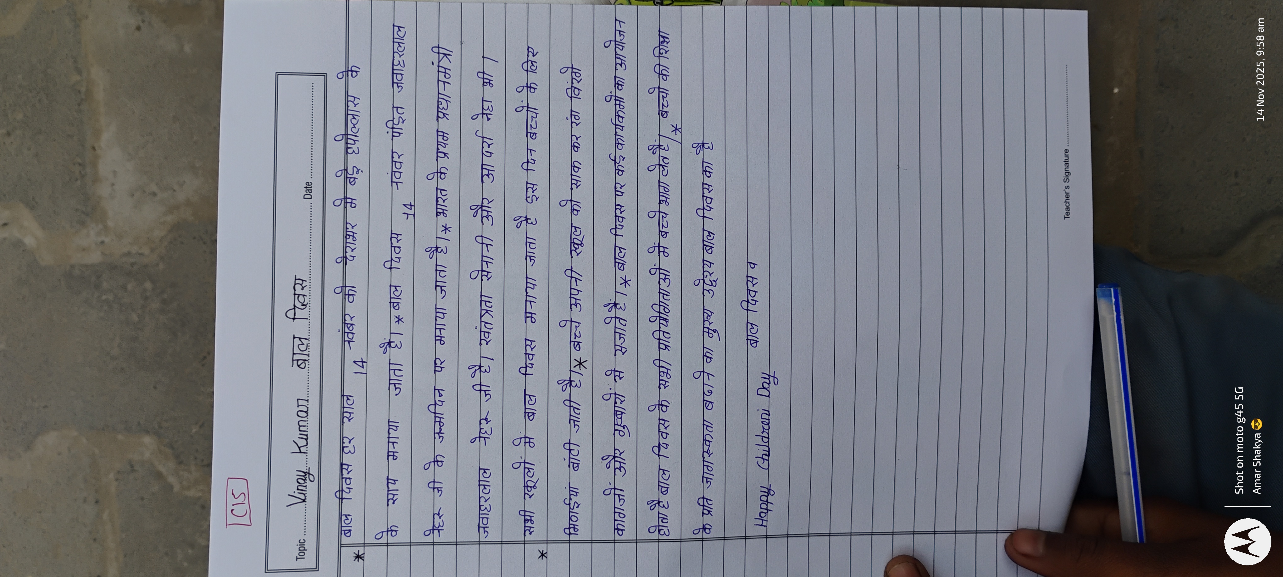 The handwriting exhibits a neat and upright style, as seen in the consistent formation of characters like "बाल दिवस" and "नवंबर". The writing maintains a fairly consistent baseline, although there's some slight variation in letter height and spacing. The overall impression is one of carefulness and a desire for legibility, but perhaps lacking a bit of personal flair.