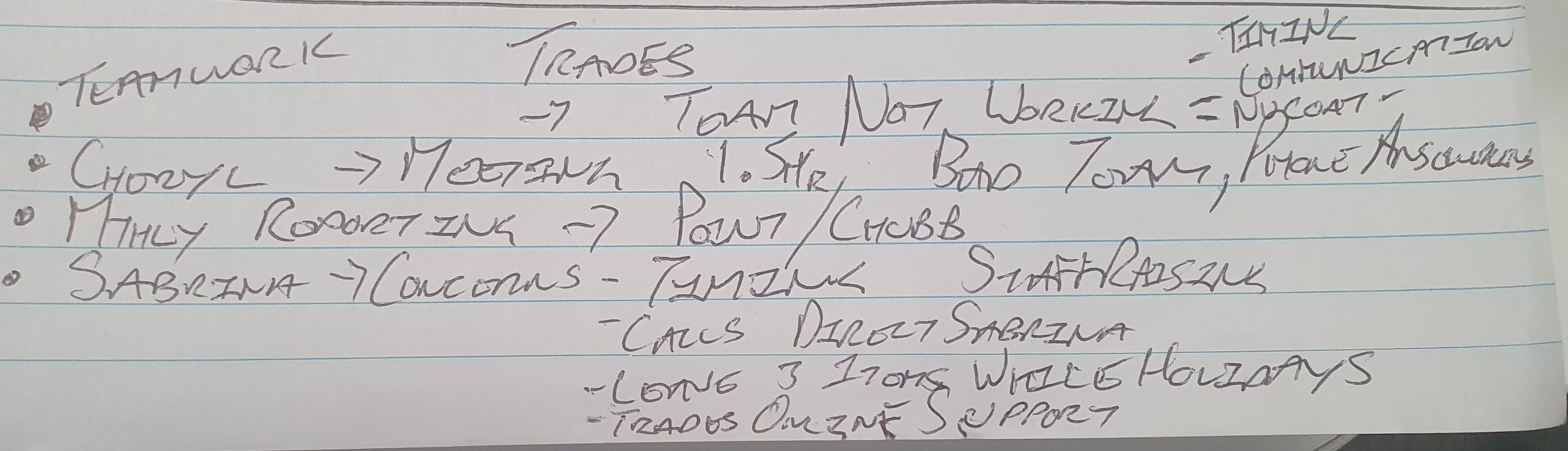 The handwriting sample presents as a functional, if somewhat hurried, script. There's a clear attempt at legibility, though the letter formation is not always consistent. For example, the 'M' in "TEAMWORK" differs slightly from the 'M' in "MONTHLY". The connections between letters are sometimes present, creating a slightly cursive effect, while other times the letters are distinct and separate. The size of the letters is relatively uniform, but the spacing between words varies. Overall, the handwriting appears to be a tool for quick note-taking rather than a carefully crafted form of expression.