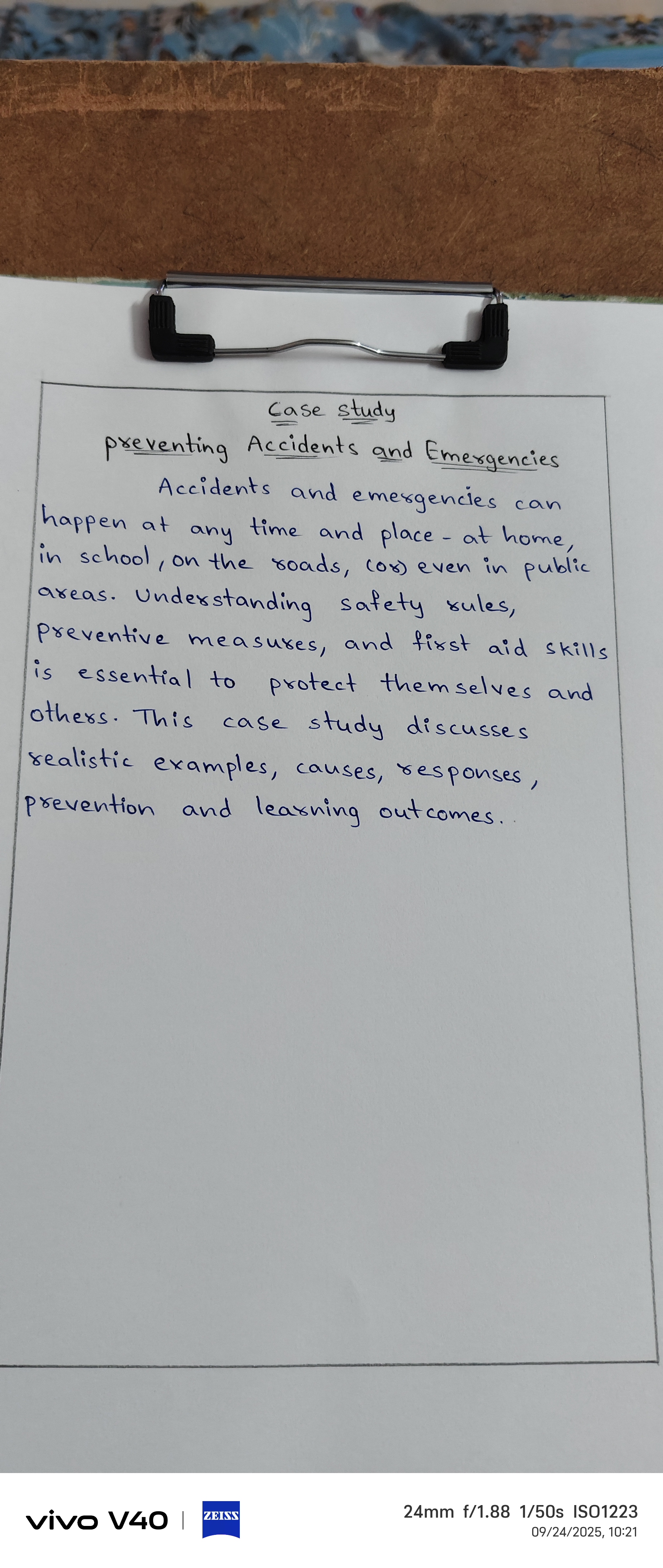 This handwriting style is characterized by its upright posture and rounded letter forms, evident in words like "Accidents" and "emergencies". The writing maintains a fairly consistent size and spacing, although there's a slight variation in letter height, particularly noticeable between upper and lowercase letters. The loops in letters like 'p' and 'g' are moderately extended. The writing is generally neat and legible, though there is some inconsistency in the pressure applied, which affects the darkness of the ink.