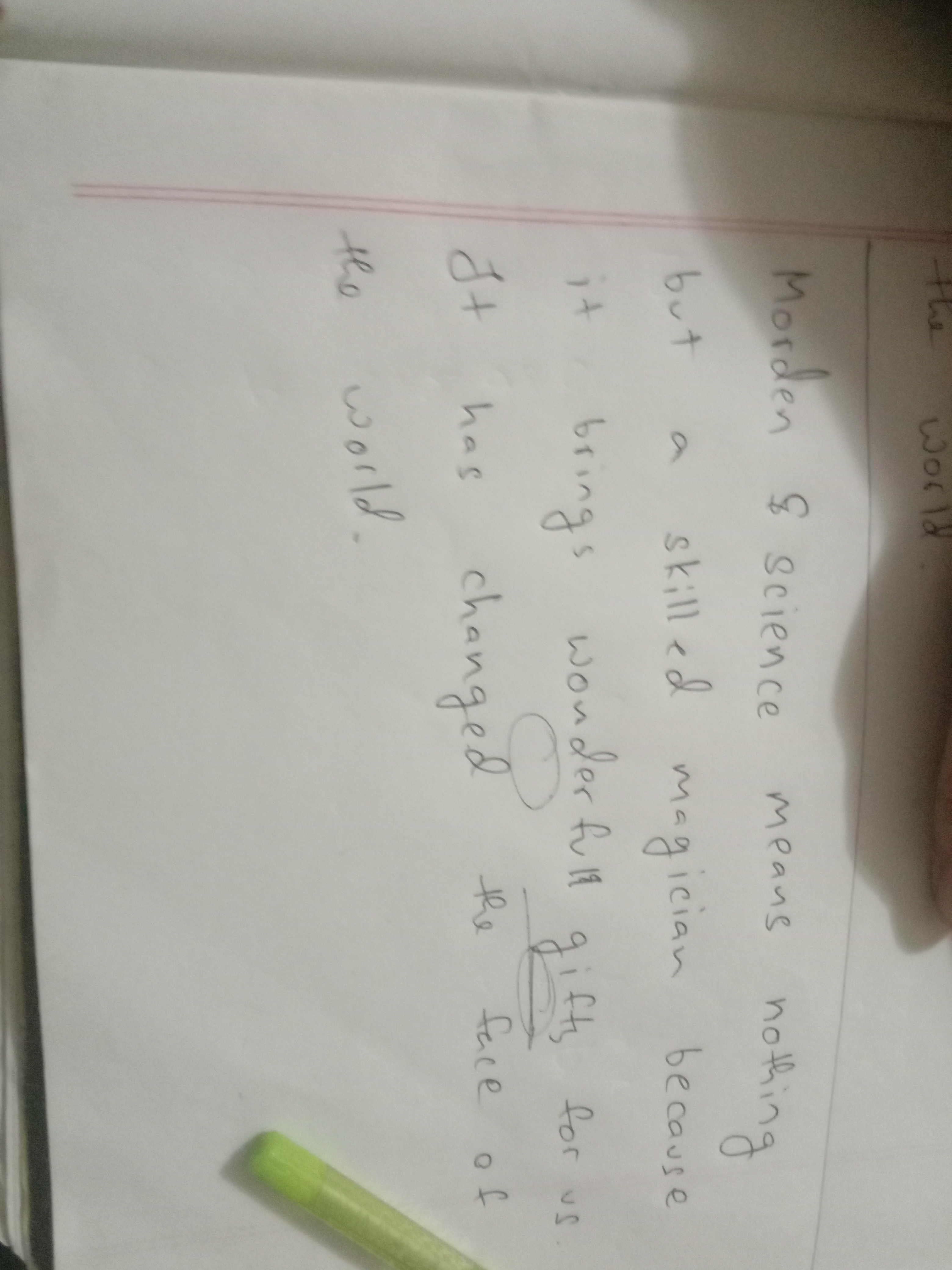 The handwriting style leans towards simplicity, with rounded forms and a slightly upright slant. There is a noticeable attempt at neatness, though consistency varies throughout the sample. Letter formations are generally clear, such as in "science" and "magician", but the spacing is uneven, impacting overall legibility. The size of the letters is relatively uniform, indicating a desire for balance, but some letters, like the 'g' in "brings", are less defined, suggesting a momentary lapse in concentration.