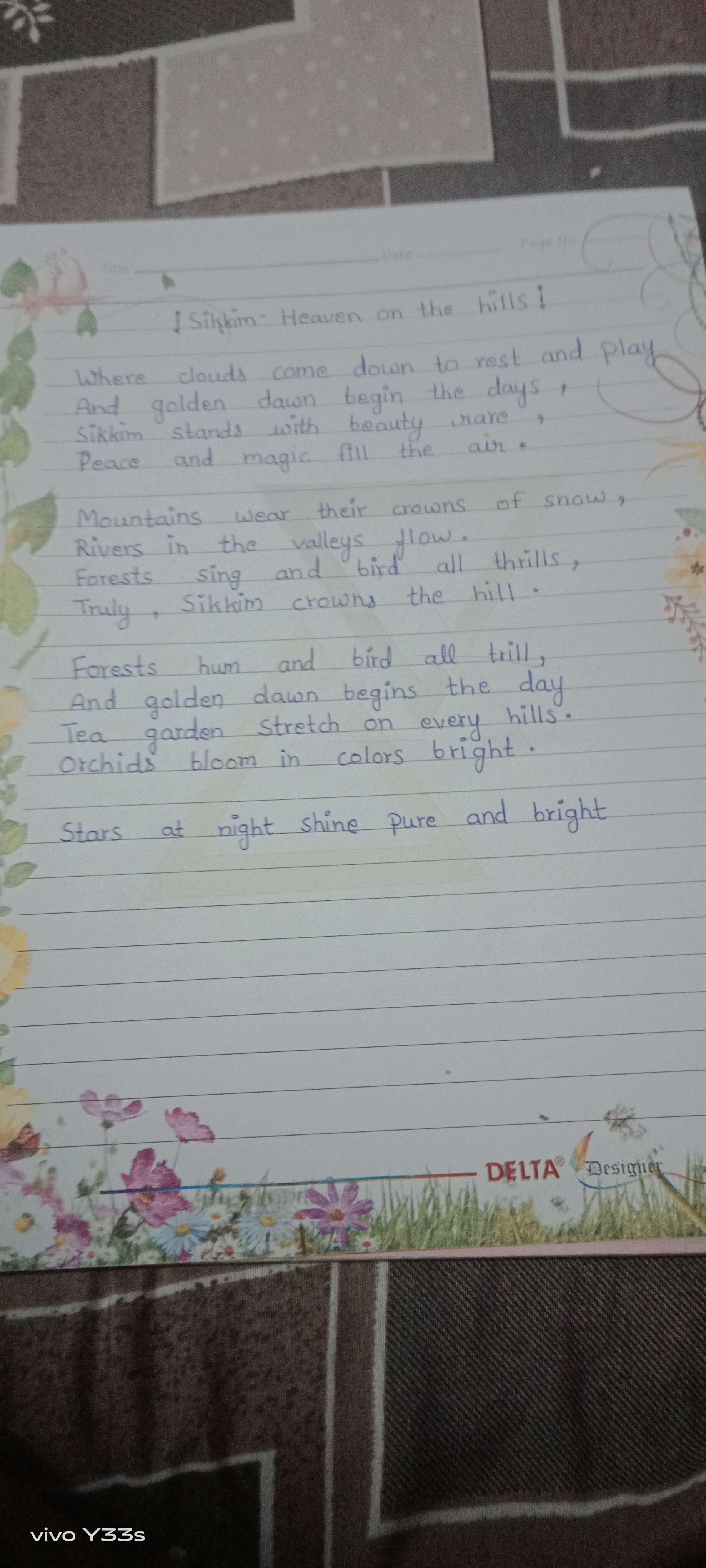 This handwriting suggests a personality that is expressive, imaginative, and possibly inclined towards artistic pursuits. The forward slant indicates enthusiasm and a desire to connect with others. The rounded letter formations imply a gentle and agreeable nature, while the slight inconsistencies hint at a spontaneous and adaptable character. There's an overall sense of optimism and an appreciation for beauty, mirroring the poetic nature of the written content itself.