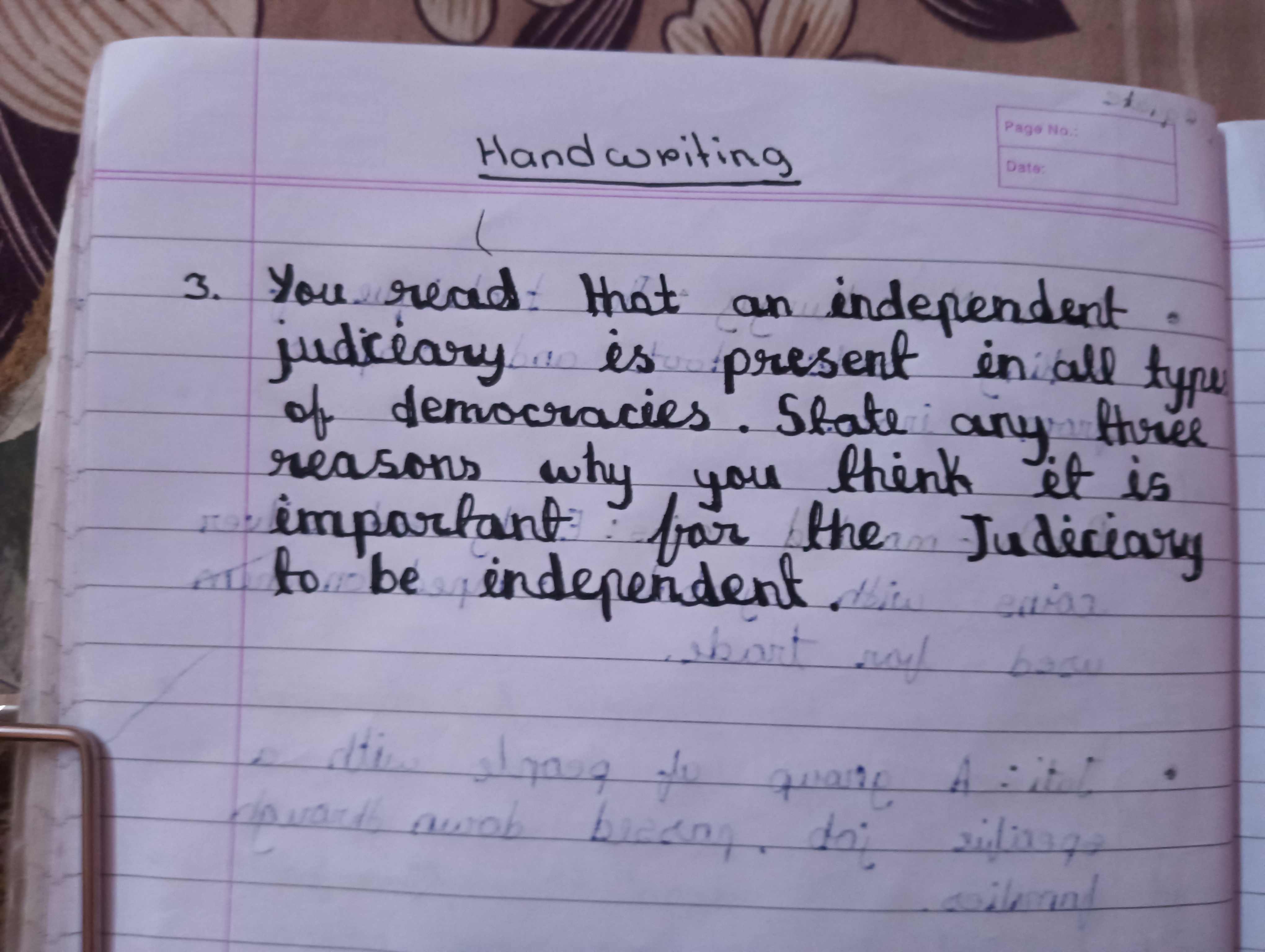The handwriting presents a mix of carefulness and slight haste. The letter formation is generally clear, with rounded shapes and consistent sizing. Words like "judiciary" and "independent" are legible, though some connections between letters appear rushed, particularly in words like "democracies". The overall impression is that the writer is prioritizing getting the ideas down rather than perfecting the penmanship. There's a noticeable slant, giving the writing a dynamic feel.
