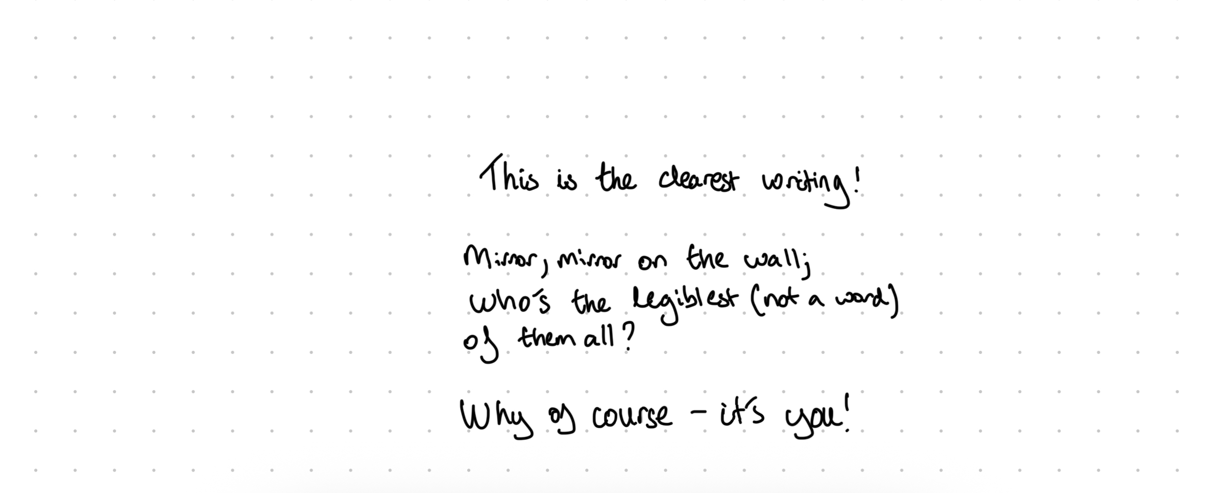 Your handwriting is a blend of casual loops and slightly inconsistent letter formations. The slant is mostly upright, suggesting a balanced approach. The letter size is moderate, filling the available space without crowding. There's a playful bounce to the baseline, evident in phrases like "the clearest writing!" and "Why of course", which adds a touch of whimsy. The letter 'r' is interesting as sometimes it's clear and other times less so.