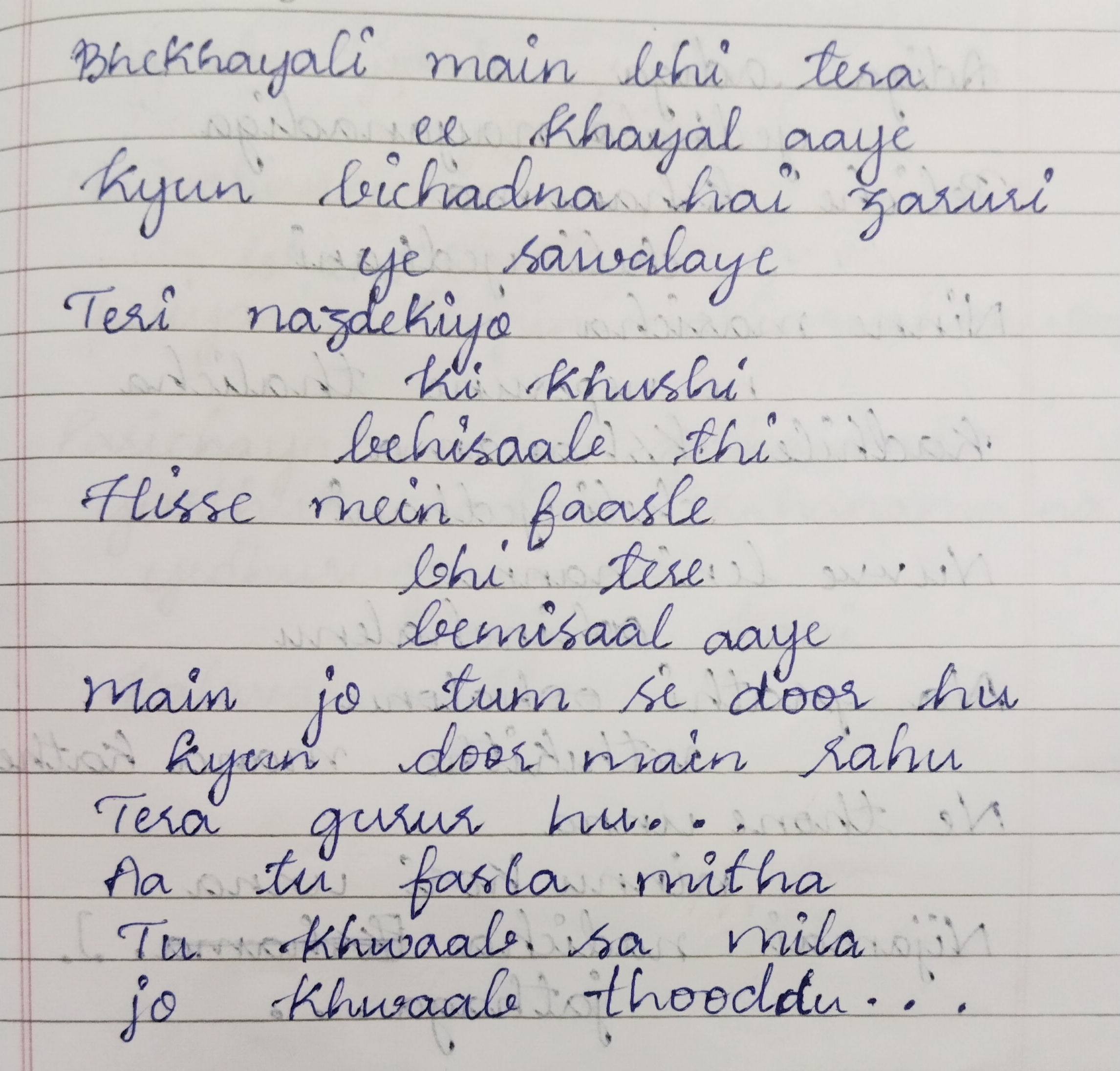 The handwriting sample presents a cursive style with a noticeable slant to the right, evident in words like "khayal" and "zaruri." The letter formations are generally rounded, giving a soft and flowing appearance, though consistency varies, as seen in the different heights of the letters. The baseline undulates slightly, and there's a moderate pressure applied, suggesting a gentle but firm hand. Overall, the handwriting leans towards a decorative aesthetic rather than strict functionality.