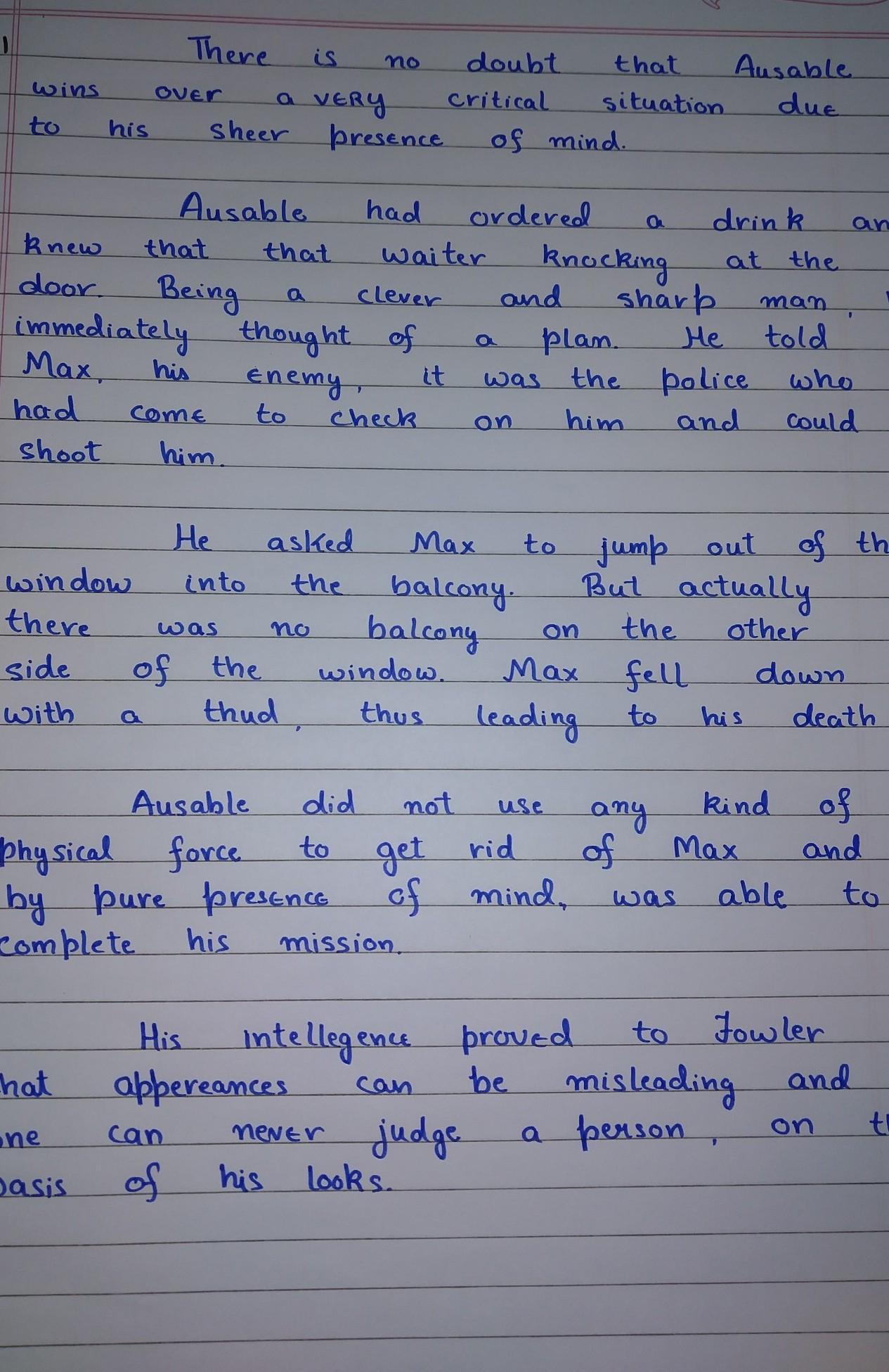 The handwriting style is neat and legible, demonstrating a clear and deliberate approach to writing. The letters are well-formed and consistently sized, showing attention to detail. There is a slight slant to the right, which adds a touch of personality. Words are evenly spaced, contributing to the overall readability of the text. Phrases such as "sheer presence of mind" and "critical situation" are written with a firm hand, indicating a confident stroke. Overall, the handwriting is practical and easy to read.