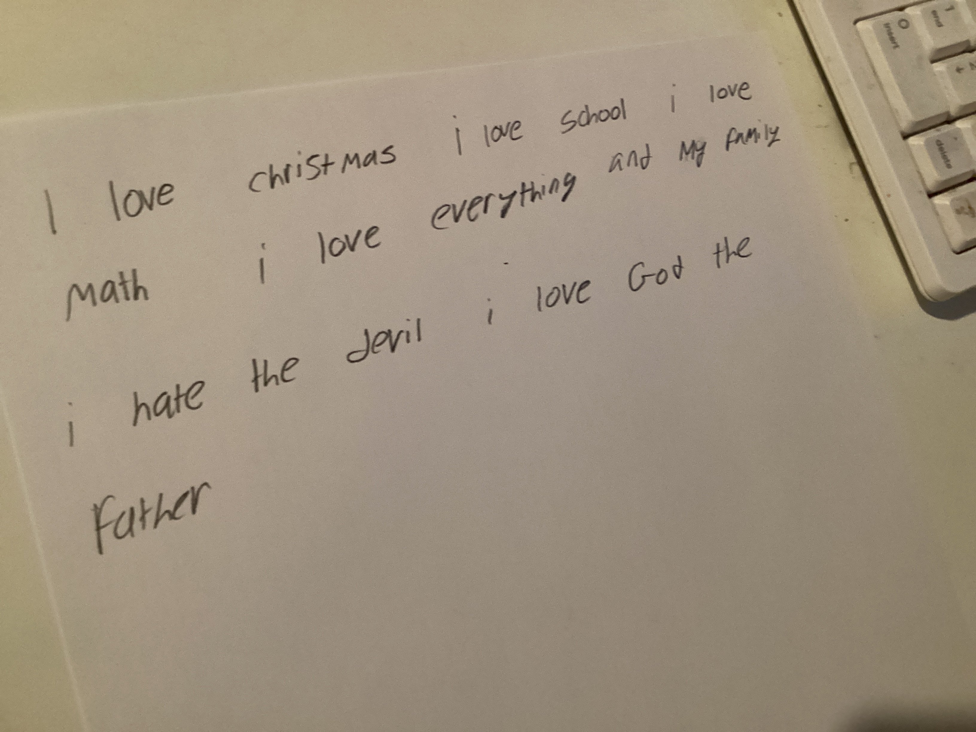 The handwriting style presents as simple and direct, with clear, block-like letter formations. The letter size is fairly uniform and large. There's a slight forward slant, suggesting a level of engagement and forward-thinking. Spacing between words is consistent. Words such as 'Christmas' and 'everything' appear carefully written, suggesting attention to detail, but 'devil' and 'hate' are also clear and deliberate. Overall, the writing appears deliberate, without flourish or embellishment.