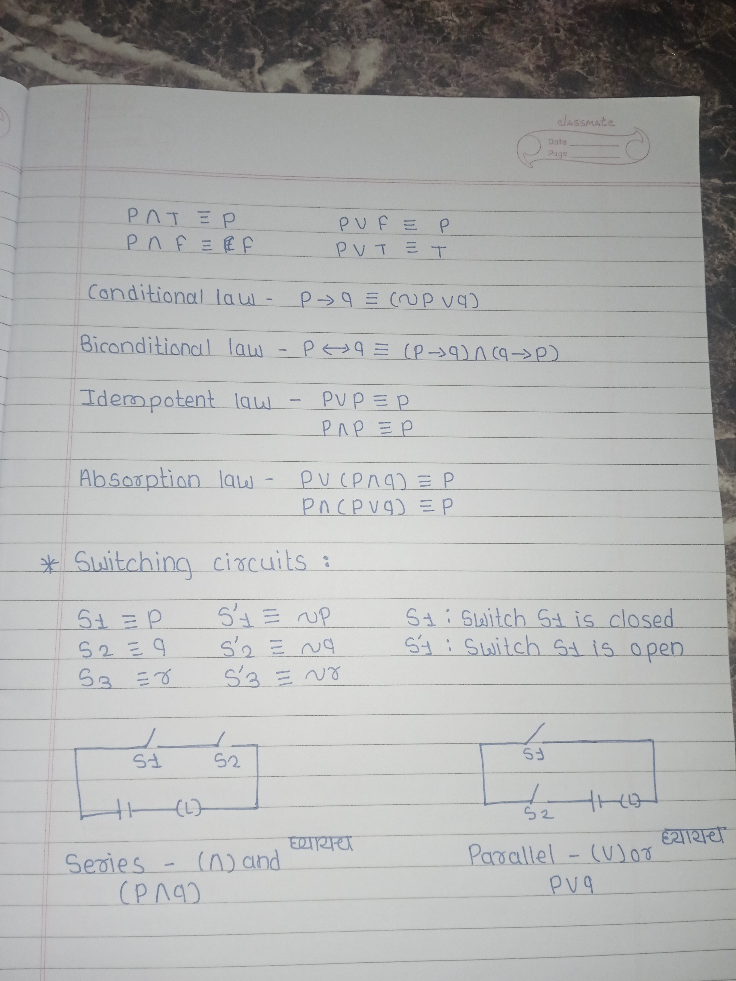 The handwriting presents a meticulous and methodical style, evident in the precise formation of letters and mathematical symbols. The consistent letter size and spacing contribute to a neat appearance, though there's a slight stiffness in the strokes. Words like "Conditional law" and "Absorption law" are written with a clear intent for accuracy, prioritizing legibility over artistic flair. The angularity in characters like 'P' and 'V' gives a structured impression.