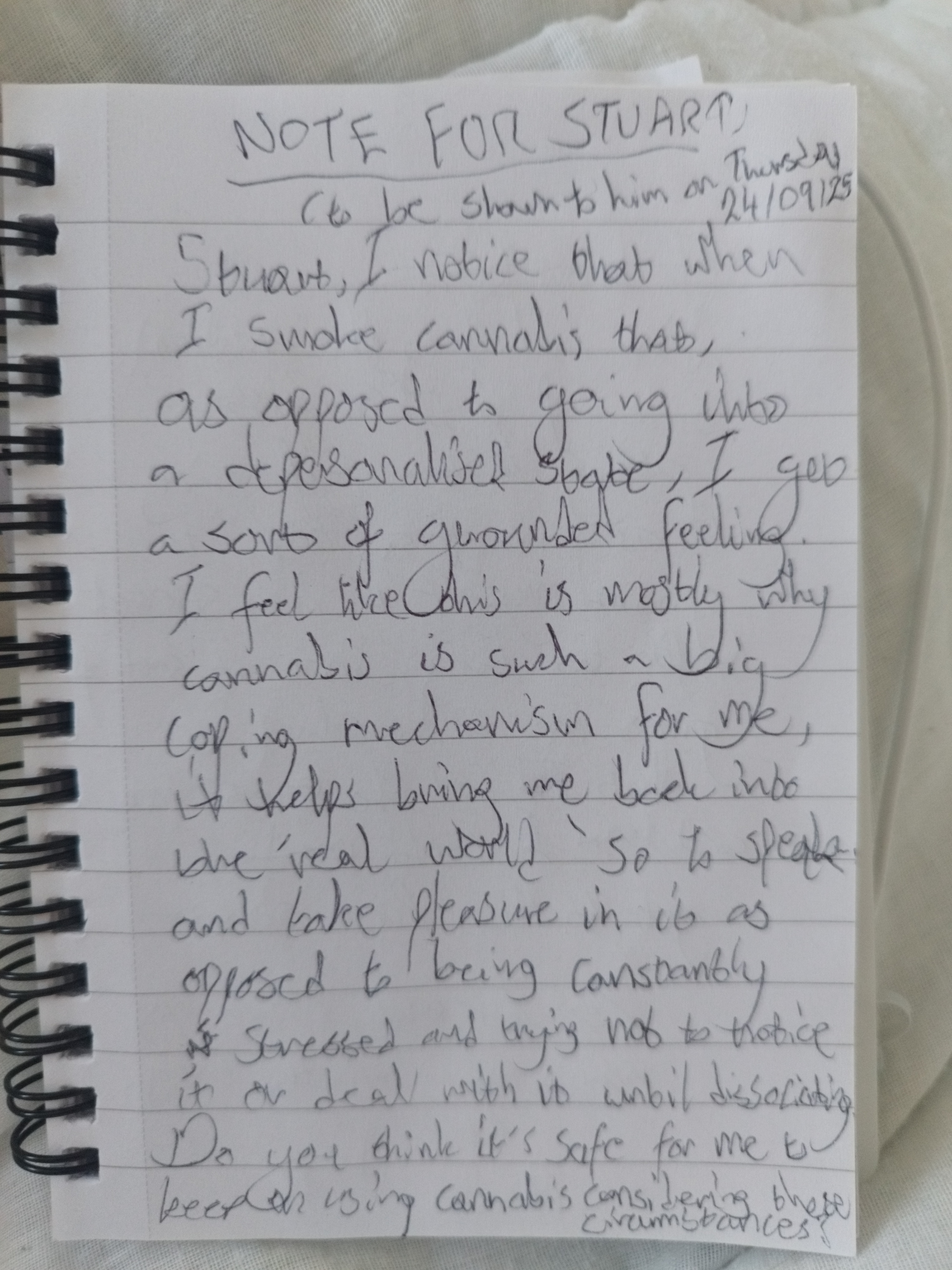 Your handwriting is characterized by its rounded letterforms and moderate slant, lending it a casual, approachable air. The letter size is relatively consistent, although there is some variation, particularly in the loops of letters like 'g' and 'y', which sometimes extend generously and sometimes retract. The baseline wavers gently, giving the writing a natural, unforced rhythm. The connections between letters are often simplified, resulting in a somewhat disconnected appearance, especially visible in words like "dissociating".