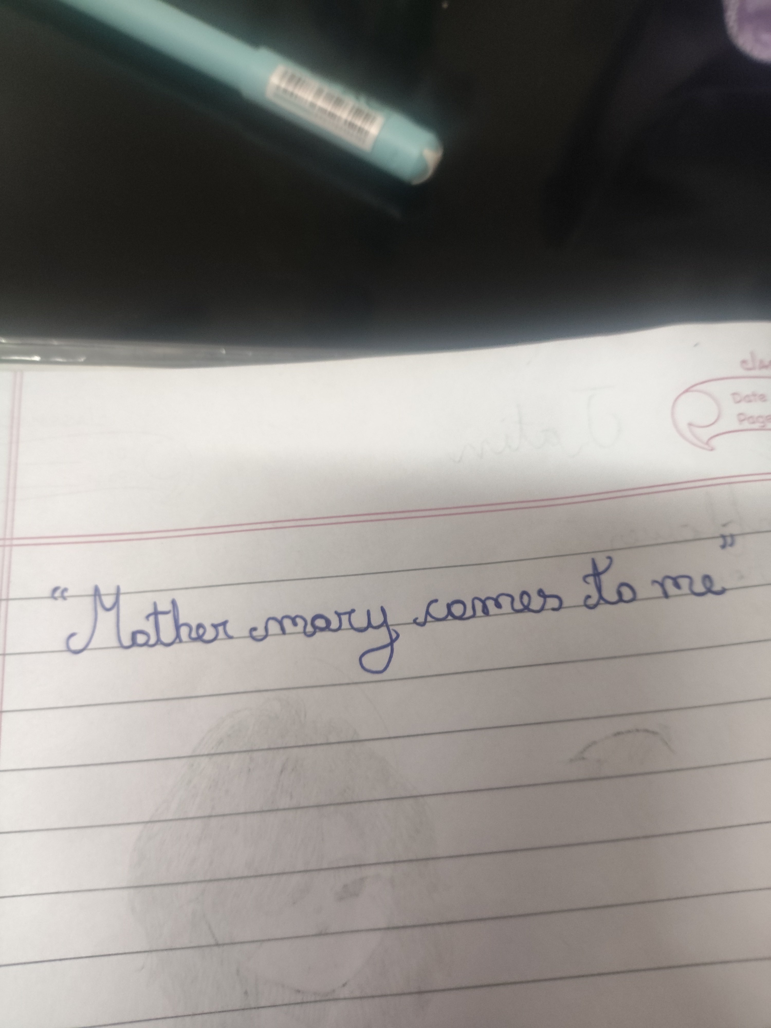 The handwriting sample presents a cursive style, characterized by rounded letterforms and connecting strokes, such as seen in "Mother mary comes to me". The writing exhibits a generally smooth flow, though there's some variability in letter size and spacing. The slant is fairly consistent, leaning slightly to the right. The pressure appears moderate and consistent, suggesting a relaxed hand. Overall, the writing has a gentle and approachable quality.