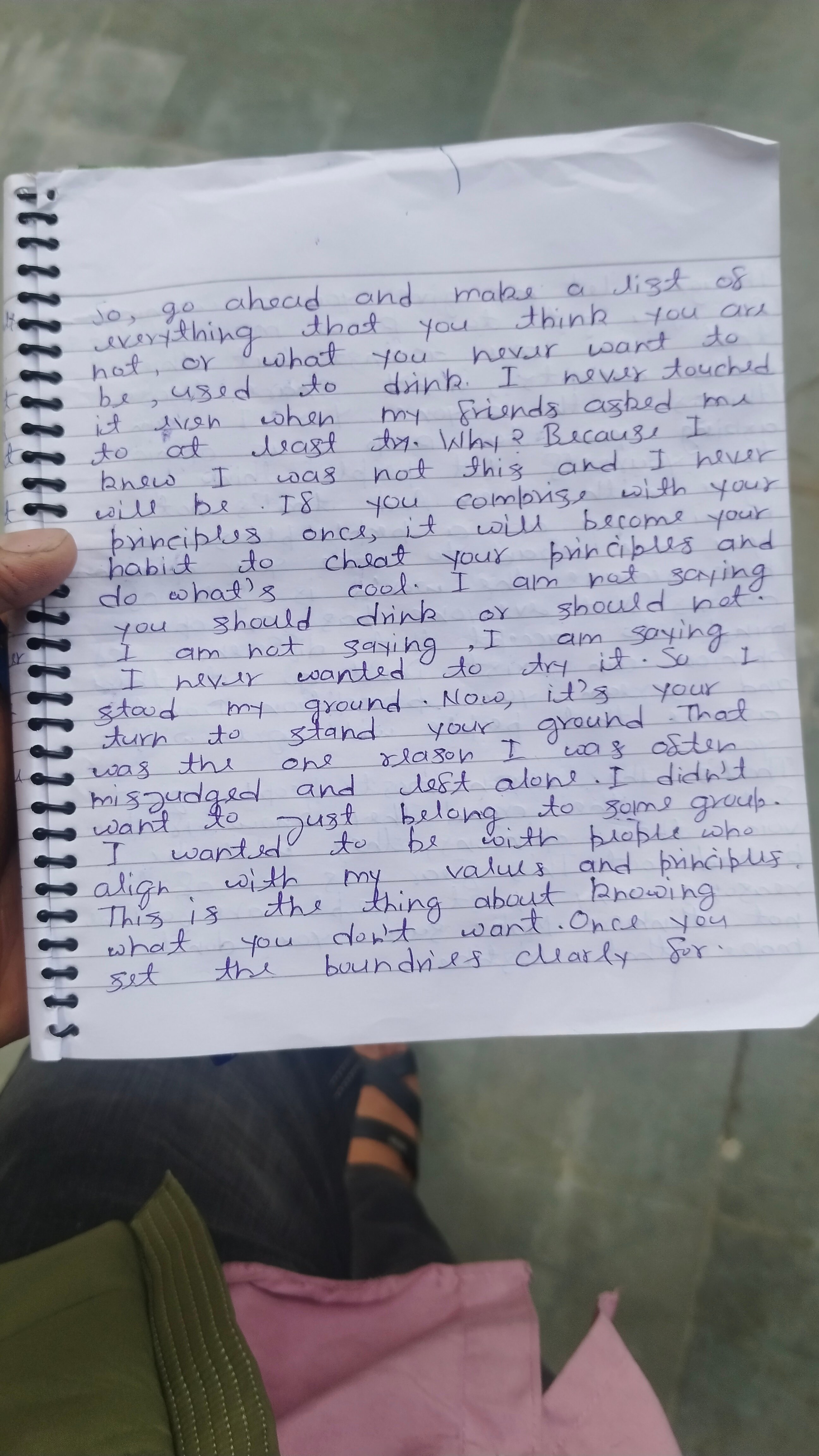 The handwriting suggests an independent and principled individual, but could benefit from improvements in consistency and letter spacing to enhance legibility.