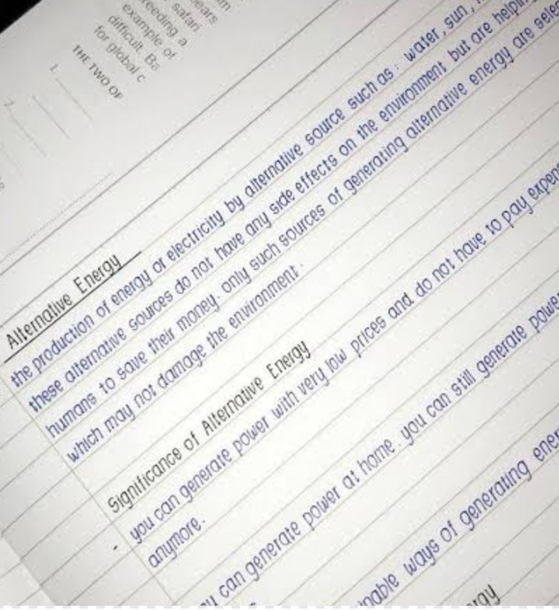 The handwriting is neat and consistent, suggesting a structured approach to communication. The letter size is moderate, and the spacing between words is even, contributing to the overall legibility. The slant is slightly to the right, indicating a natural and unforced flow. Words like "alternative energy" and "environment" are written with clarity, highlighting the writer's focus and care in conveying these specific concepts.
