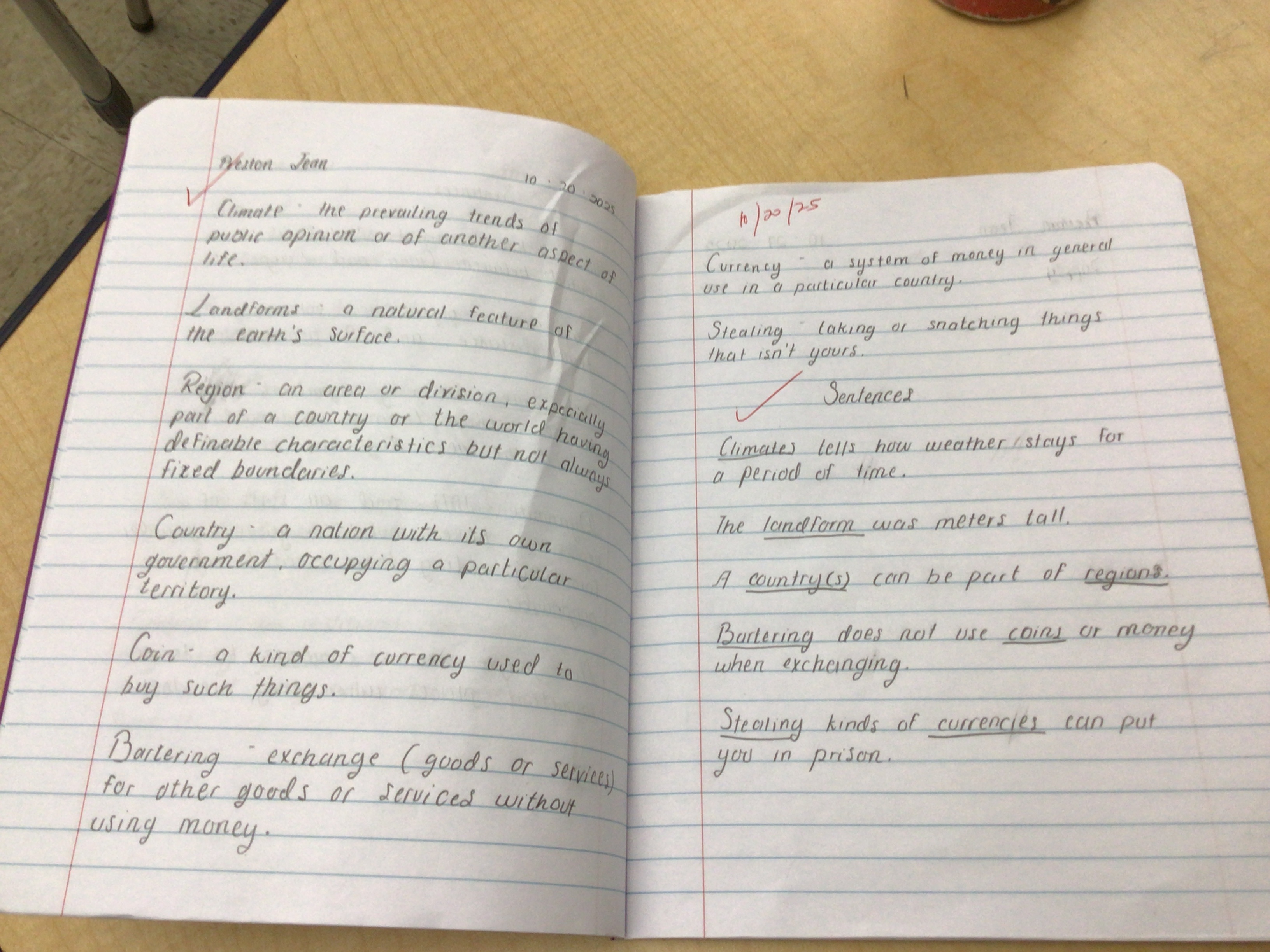 The handwriting exhibits a neat and carefully formed style. The letter formations are generally rounded, and there is a consistent slant to the right, visible in words like "Climate" and "Landforms". The writing is well-spaced, avoiding overcrowding, and there's a deliberate quality to the strokes. Capital letters are slightly larger and more embellished than lowercase letters. The use of underlining and ticks also suggests attention to detail and organization.