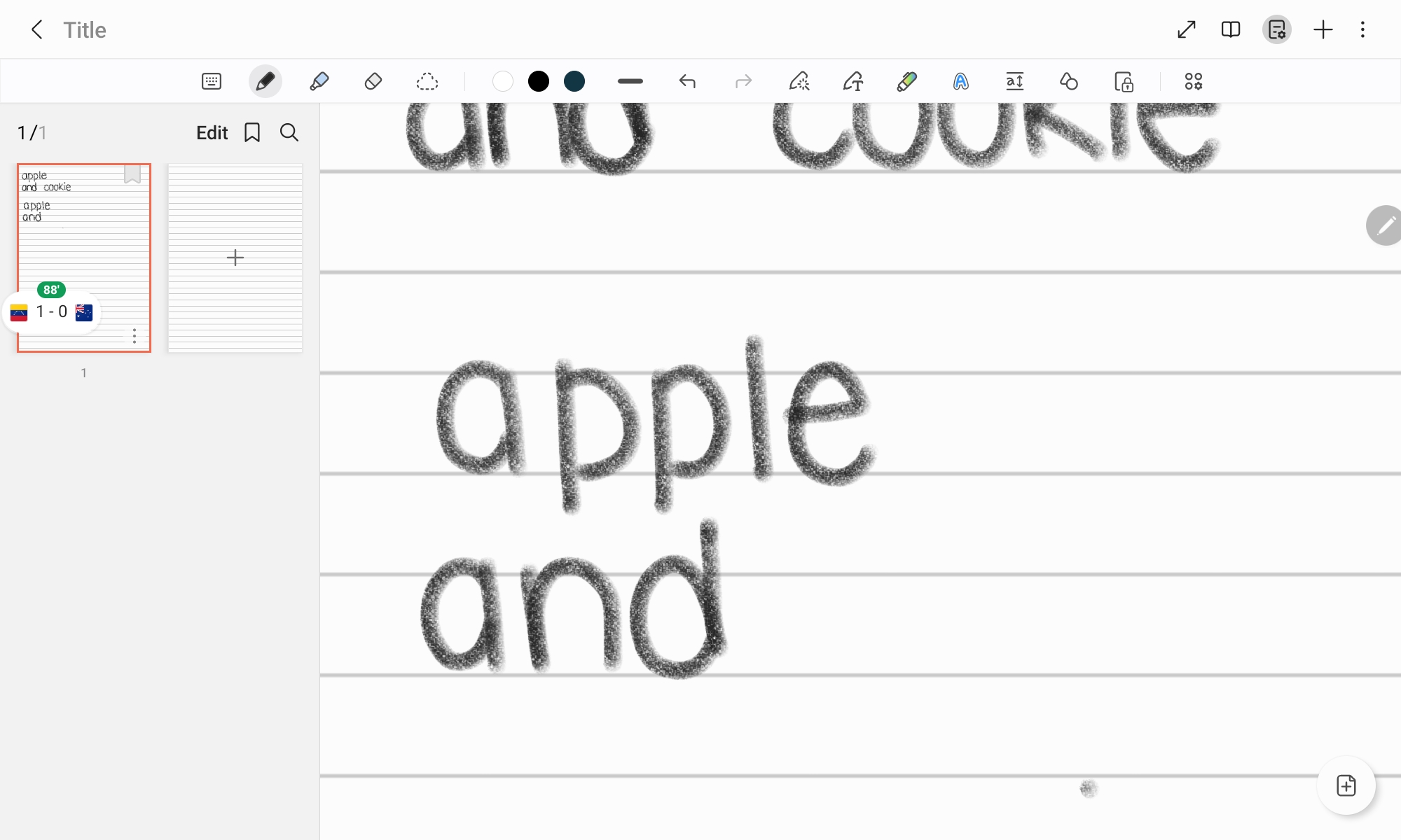The handwriting sample presents a clear, rounded style with generous spacing between letters and words, as seen in the words "apple" and "and cookie". The strokes are deliberate and somewhat uniform, giving the writing a neat appearance, though it lacks variation in pressure. The letter forms are simple and legible, with consistent letter height and spacing contributing to overall readability.