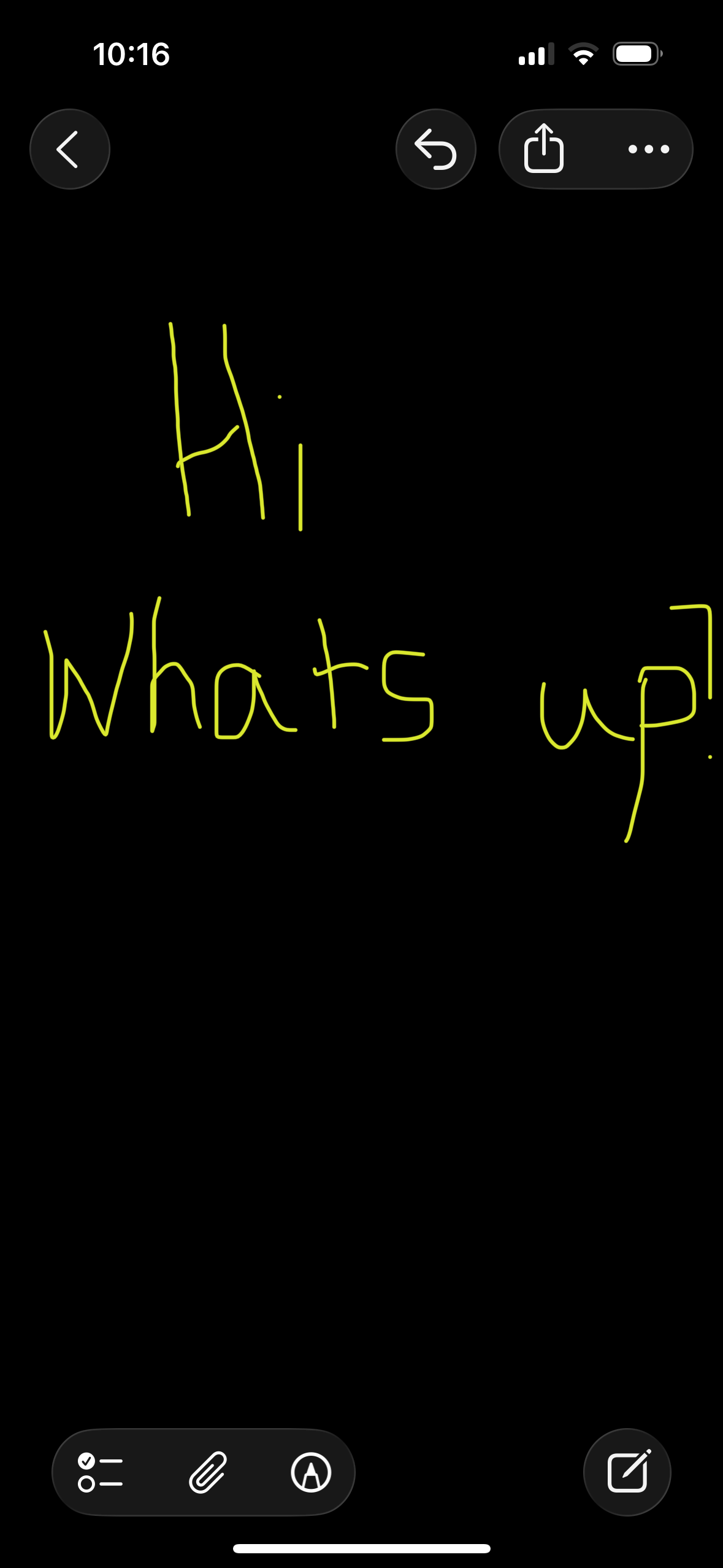 The handwriting sample showcases a style that is somewhat casual, with slightly elongated letter formations. The upward slant of the lines, as seen in "Hi" and "up?", suggests a positive outlook. The rounded shapes of letters, such as in "Whats", lend a friendly and approachable feel. The spacing between letters and words is generally adequate, contributing to readability, though there's room for improvement in consistency. The size of the letters is relatively uniform, adding to the overall neatness, although the execution appears a bit hasty.